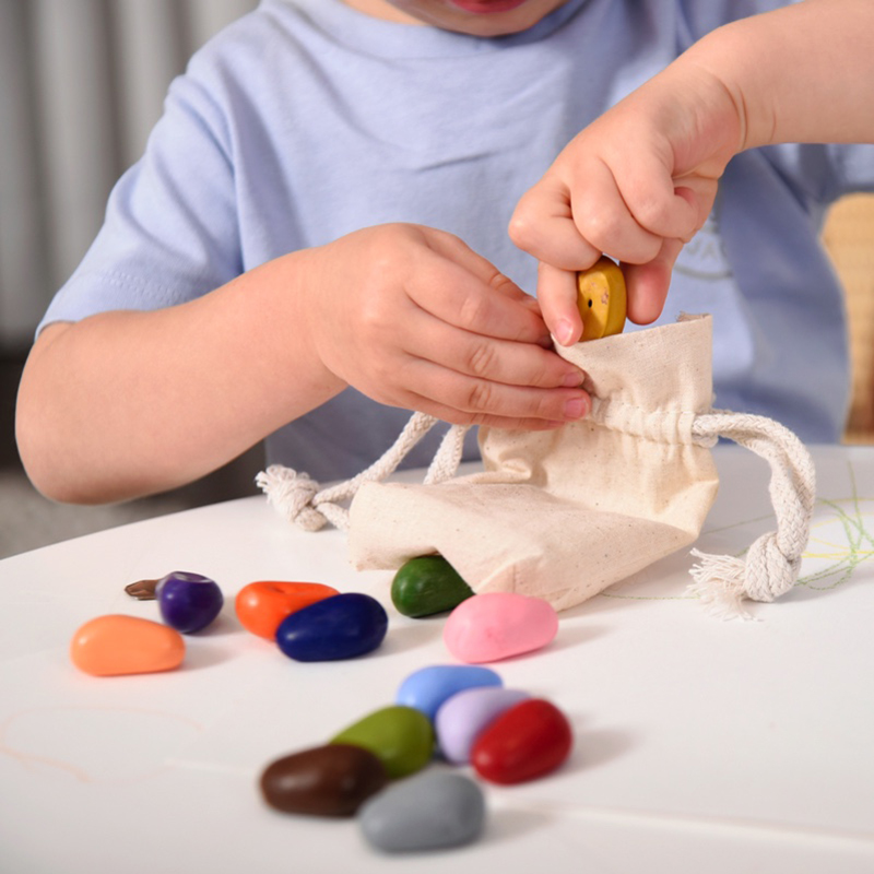 – La forme des crayons de cire (forme de caillou) permet de tenir avec 3 doigts sans effort. Un geste essentiel qui prépare les muscles de la main à l’apprentissage de l’écriture.