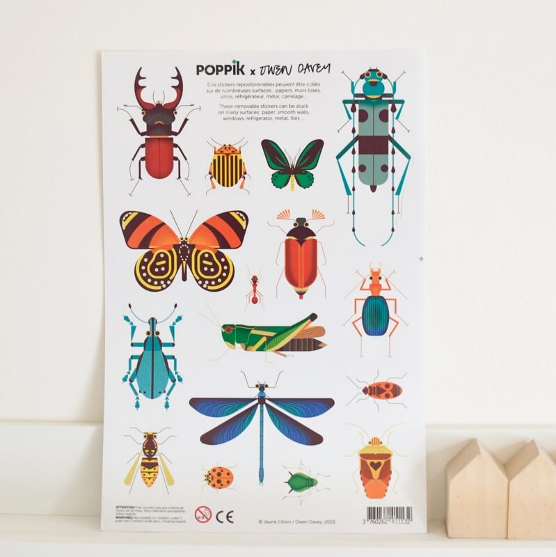 Contient : 1 planche de 16 stickers repositionnables Dès 3 ans Design : Owen Davey Des stickers pédagogiques passionnants ! De très jolis stickers pour tous les fans des petites bêtes. Les enfants s’amuseront à personnaliser leurs cahiers avec ces stickers repositionnables. Ils peuvent aussi être collés sur les murs.