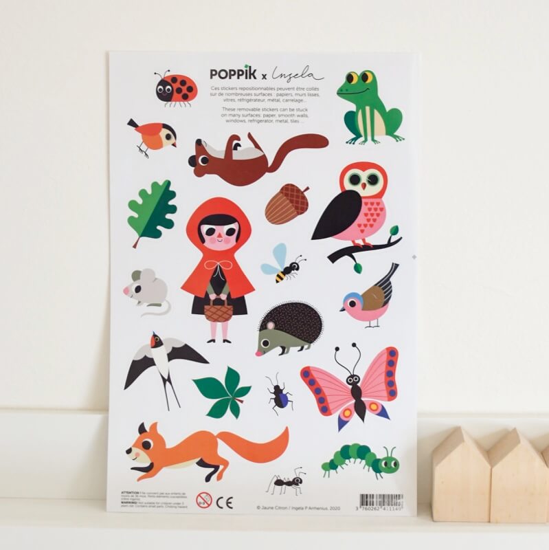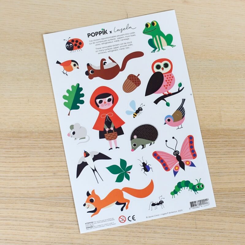 Contient : 1 planche de 16 stickers (20 x 30 cm) Stickers repositionnables Dès 3 ans Design : Ingela Arrhenius Cette belle planche de stickers animaux forêt et insectes permettra aux enfants de jouer avec des stickers, en les collant sur touts types de support : murs, fenêtres, papier… La matière repositionnable permet de ne laisser aucune trace lorsqu’on colle et on décolle les autocollants. Un jeu éducatif original qui amusera beaucoup les enfants.