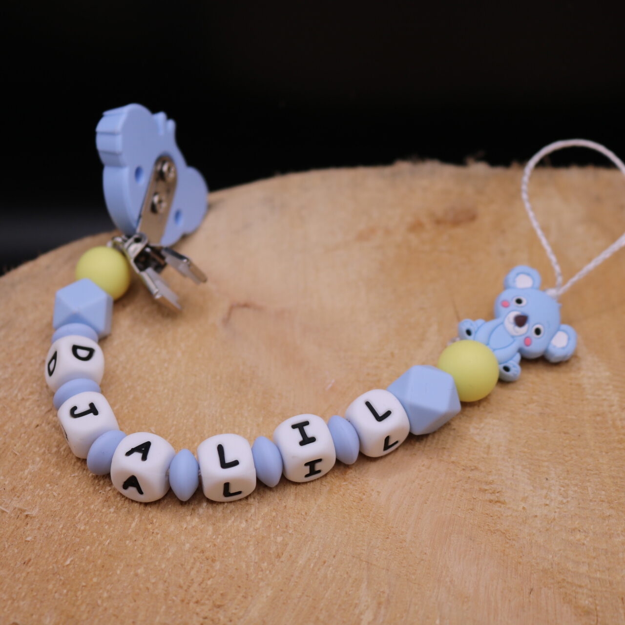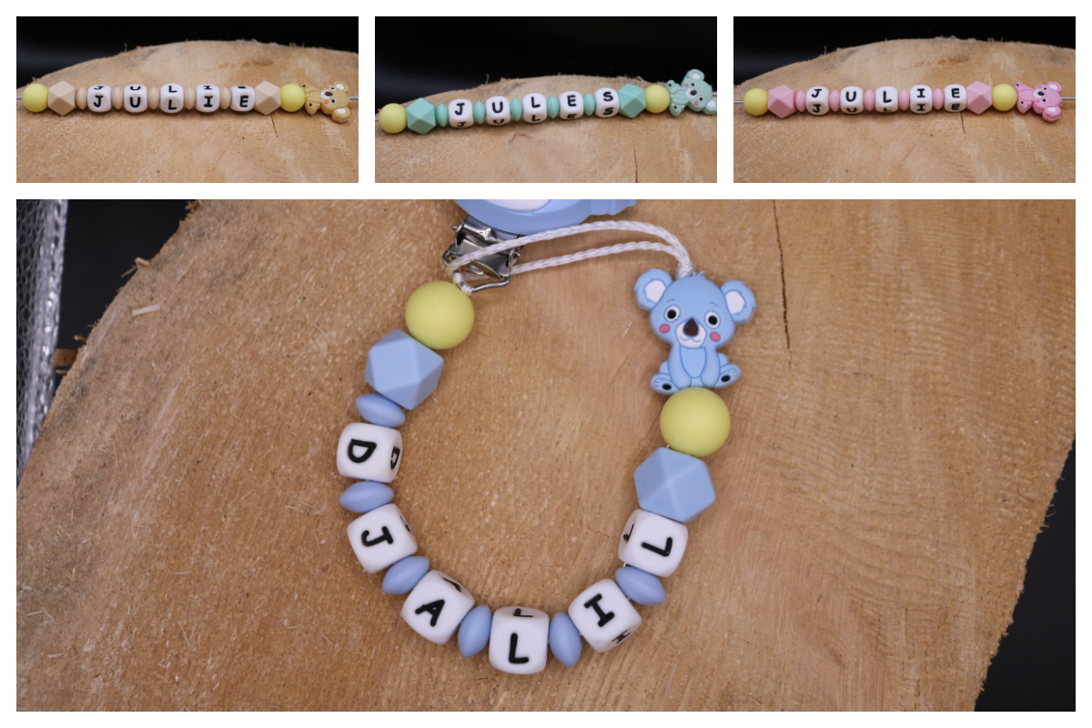 Longueur de l’attache tétine dépend du nombre de perles et de leur forme (normes 22cm max)
