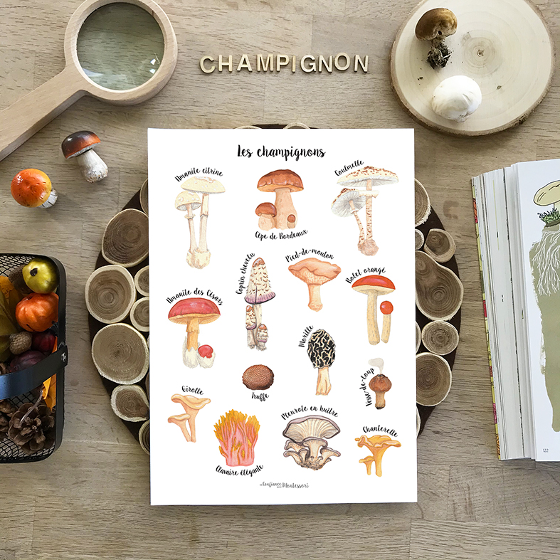 Cette affiche illustrée et peinte à la main représente 14 variétés de champignons. Elle est accompagnée de 14 cartes renseignées représentant ces mêmes champignons. C’est à la fois un matériel éducatif et une affiche décorative. Elle peut ainsi servir de support pour soutenir les apprentissages et expériences du jeune enfant. Elle peut aussi être mise en valeur dans un cadre à hauteur des yeux des enfants dans une classe ou à la maison.