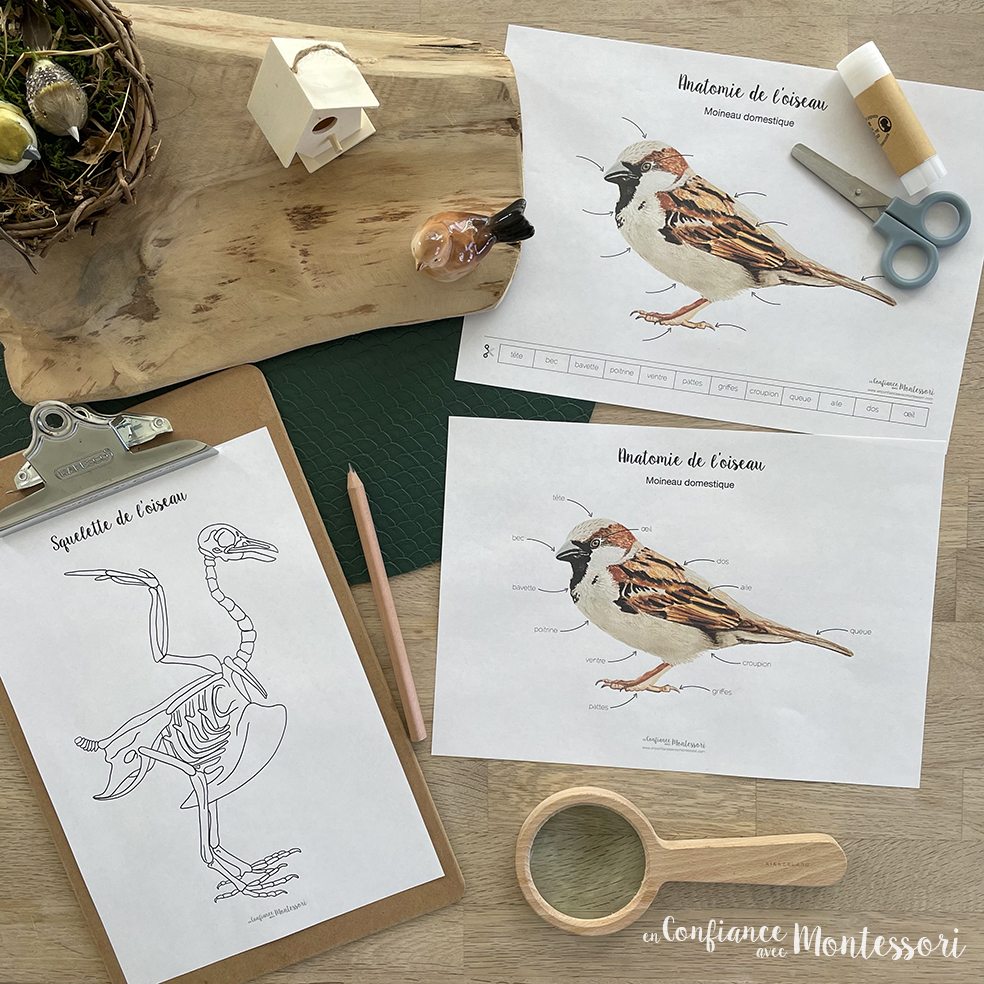 Ces affiches pédagogiques d’inspiration Montessori peuvent servir de support pour soutenir les apprentissages et expériences d’un jeune enfant de 3 à 7 ans. Elles permettent à l’enfant de découvrir les différentes parties de l’anatomie de l’oiseau : tête, bec, bavette, poitrine, ventre, pattes, griffes, croupion, queue, aile, dos œil. Elles peuvent aussi être mises en valeur dans un cadre à hauteur des yeux des enfants dans une classe, à la maison ou dans une ambiance Montessori.