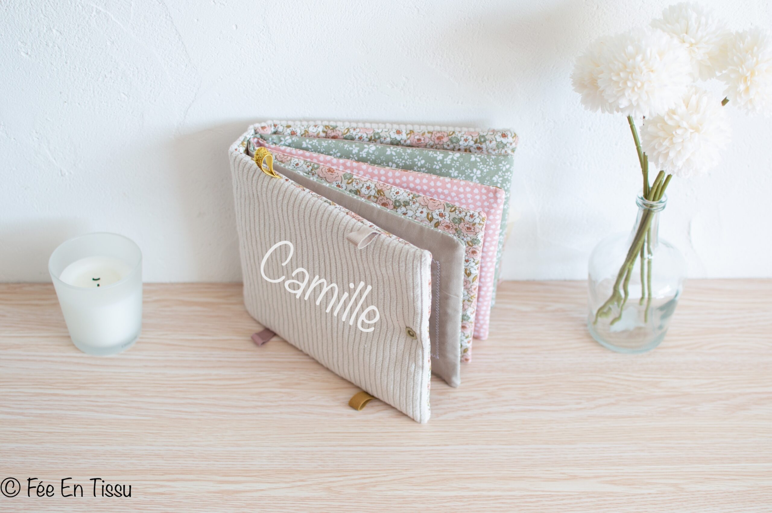 Album photo tissu pour bébé personnalisable – velours beige – imprimé fleuri