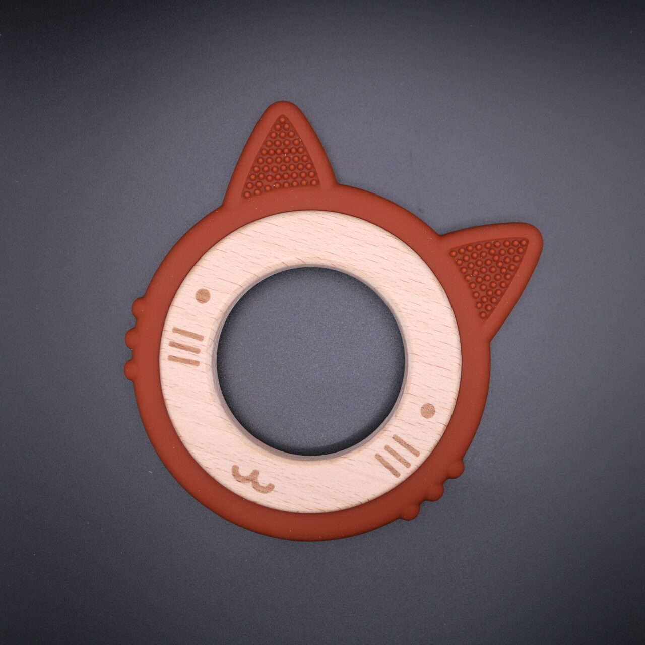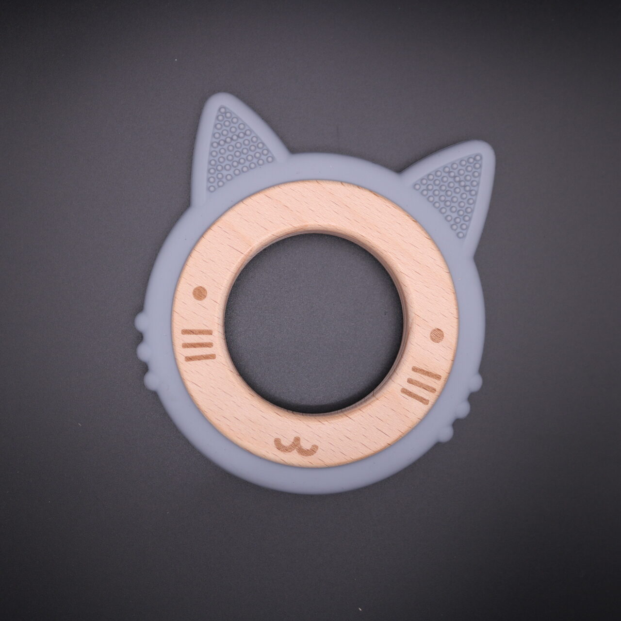 Anneau de dentition silicone et bois chat. Jouet d’éveil et de dentition, c’est l’accessoire indispensable pour masser les gencives de bébé ! Le mélange de texture soulagera rapidement bébé et le divertira. Disponible également en version hochet avec perles