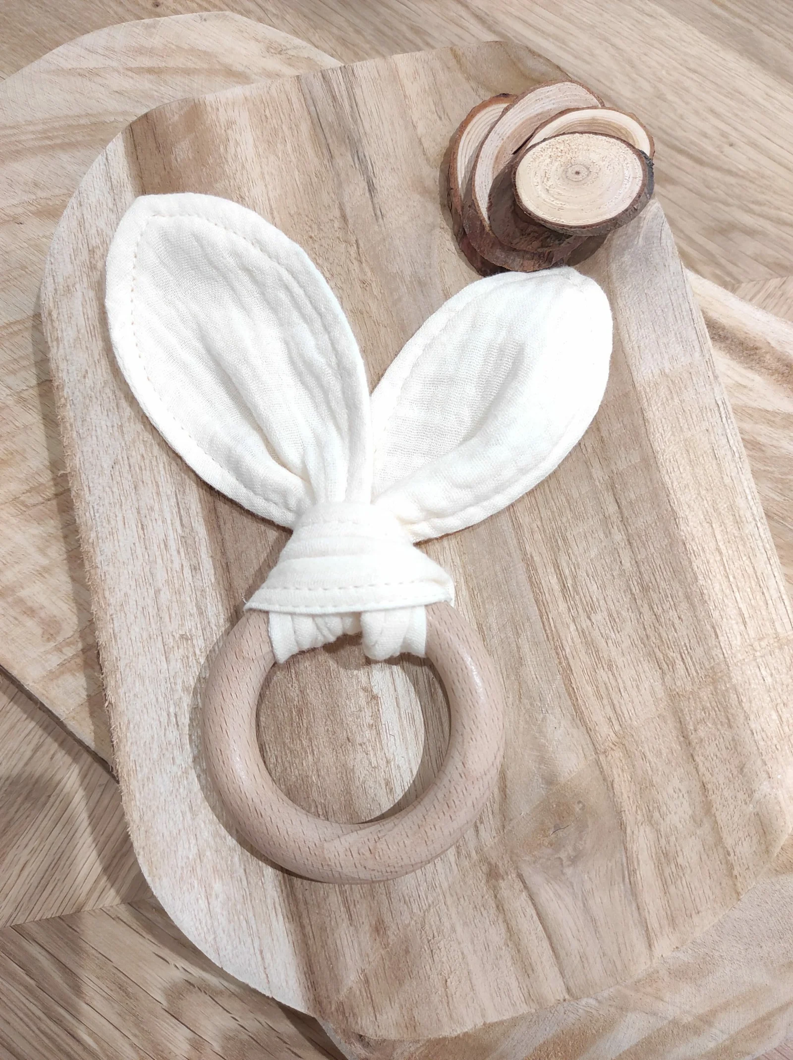 Anneau Lapin multifonction, parfait pour la dentition et le jeu. Composé de perles silicone et bois sans BPA, monté artisanalement. Personnalisable et sécurisant pour bébé.