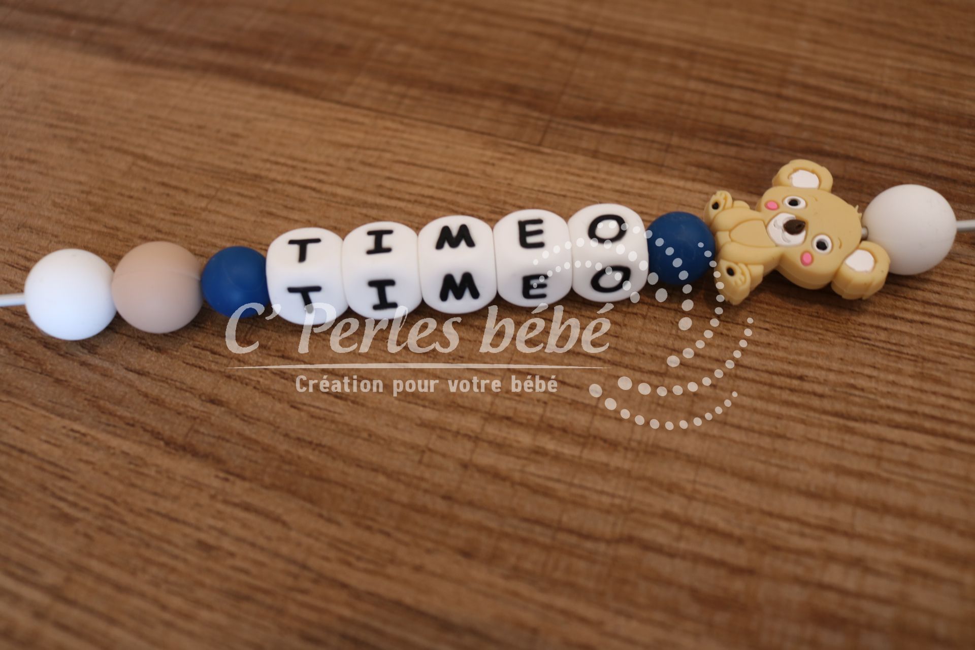 Attache doudou fait main par mes soins, modèle koala Layna entièrement personnalisable. Perles en silicone, longueur max 22 cm (respect des normes de sécurité en vigueur). Attache tétine assorti disponible.