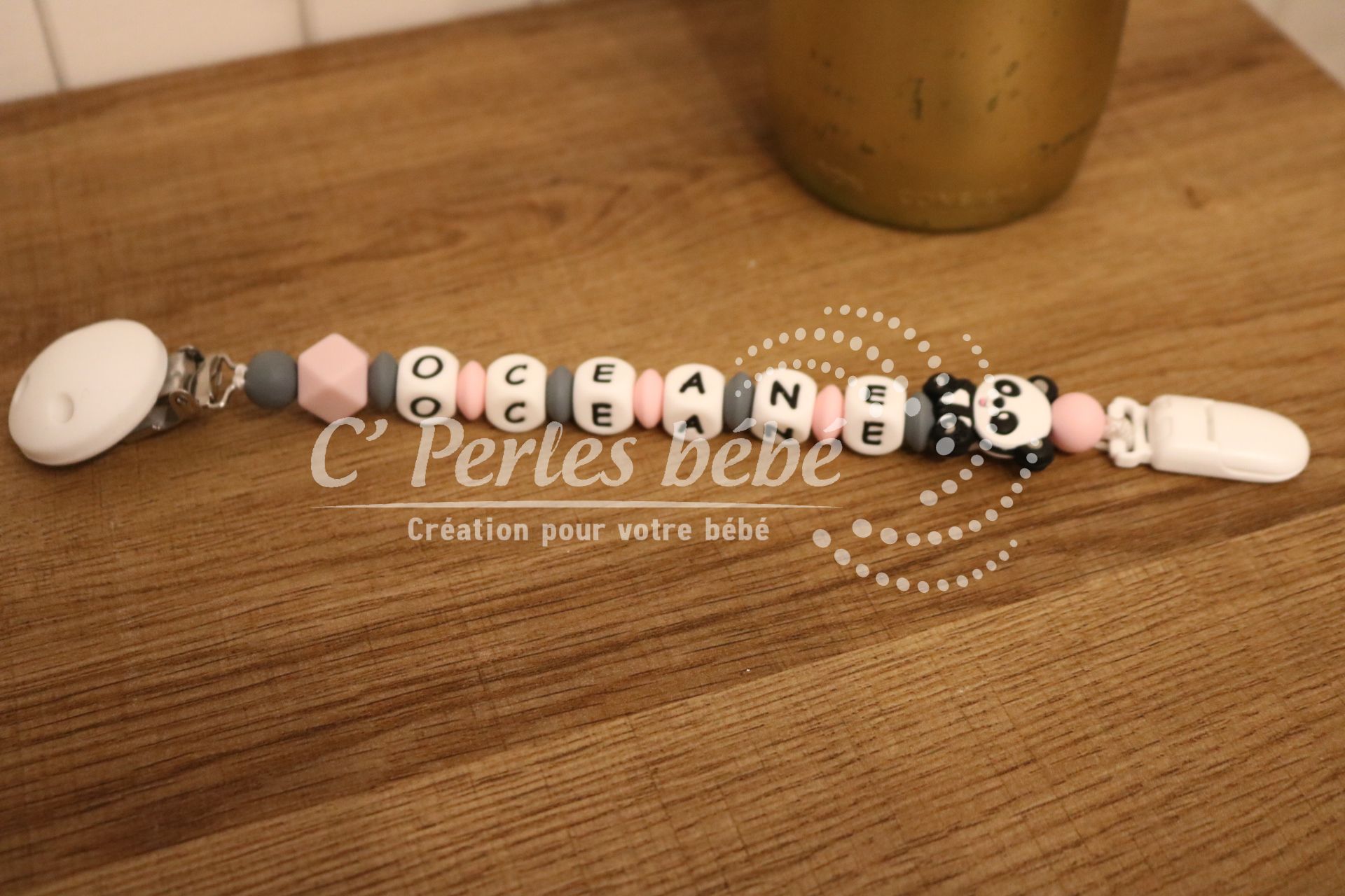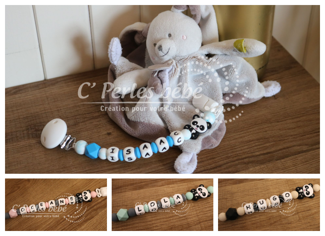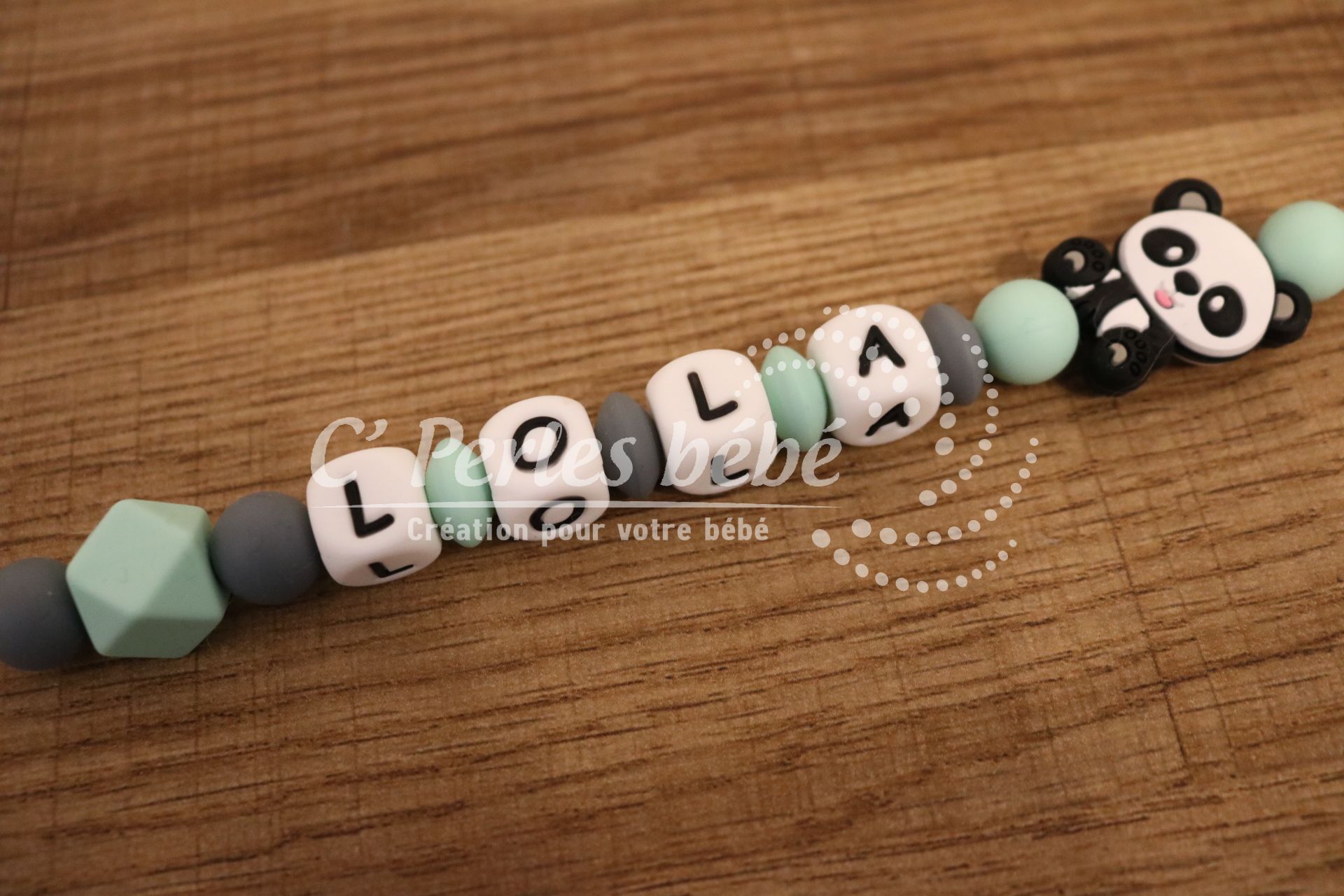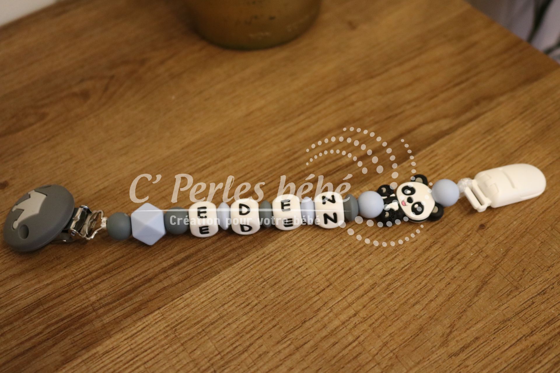 Attache doudou fait main par mes soins, modèle panda entièrement personnalisable. Perles en silicone, longueur max 22 cm (respect des normes de sécurité en vigueur). Attache tétine et hochet assortis disponibles.