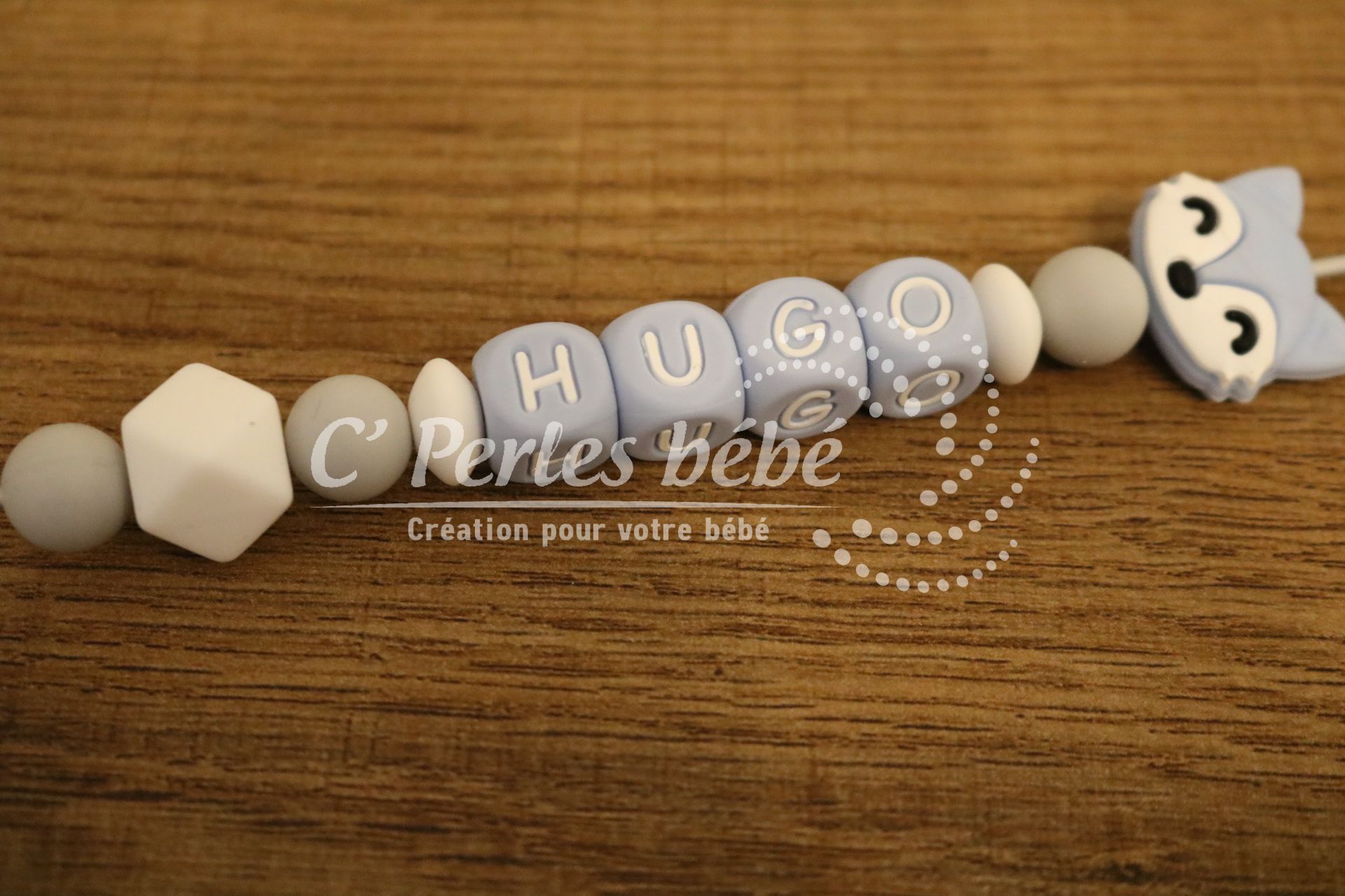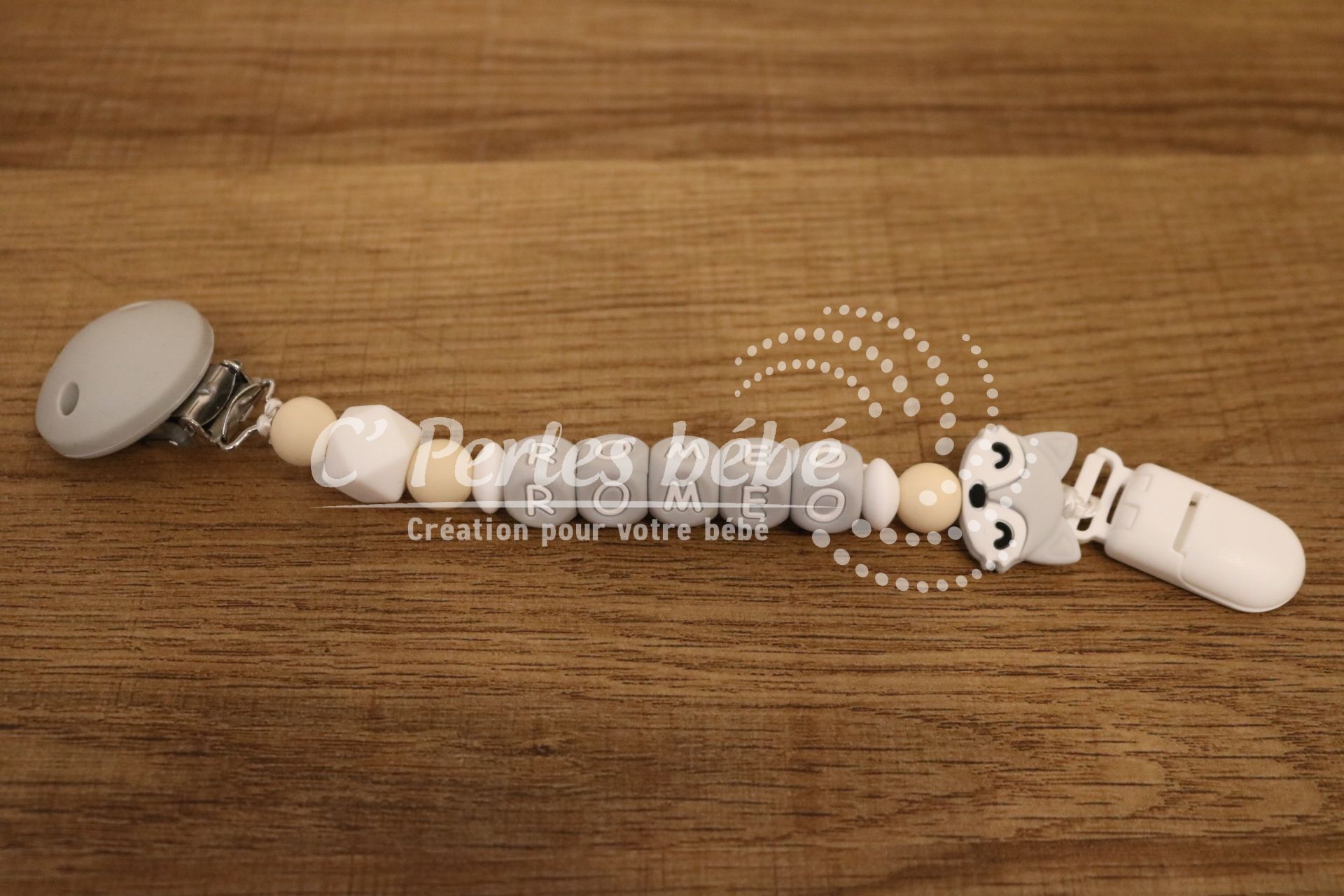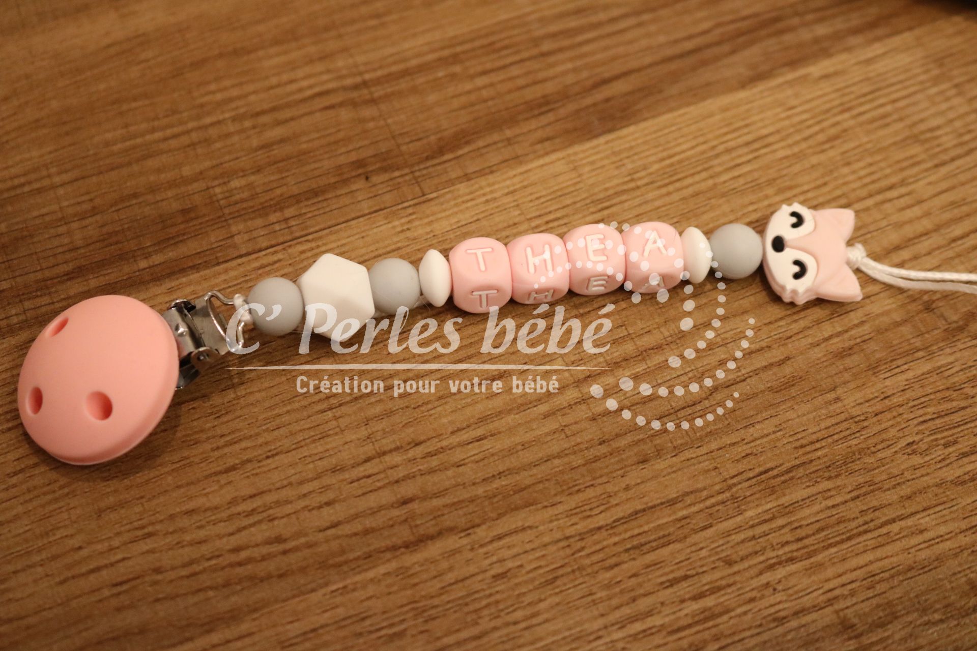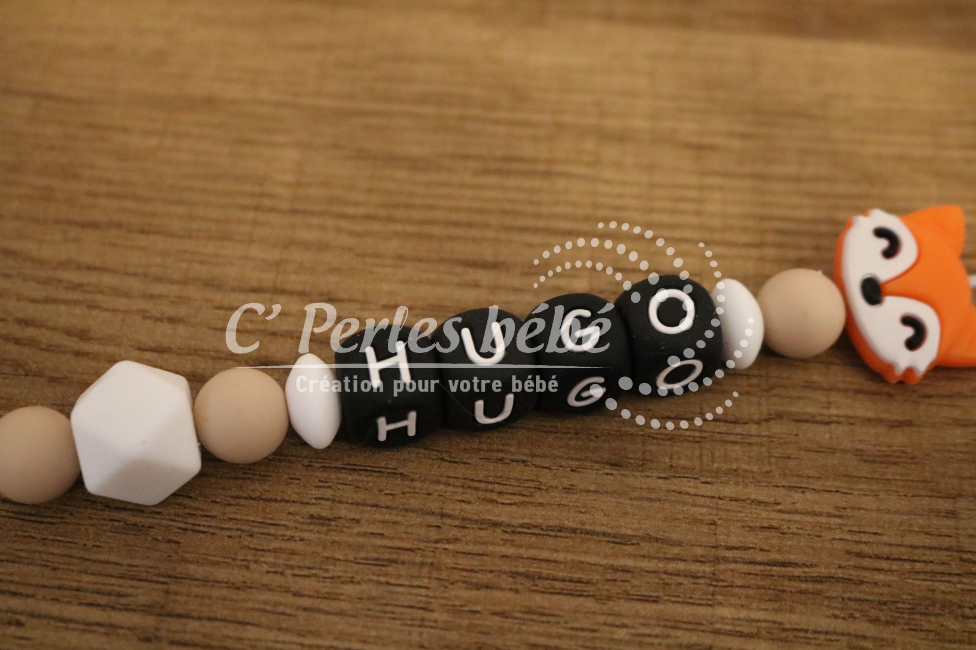 Attache doudou fait main par mes soins, modèle renard coloré entièrement personnalisable. Perles en silicone, longueur max 22 cm (respect des normes de sécurité en vigueur). Attache tétine, anneau de dentition et hochet assortis disponibles.