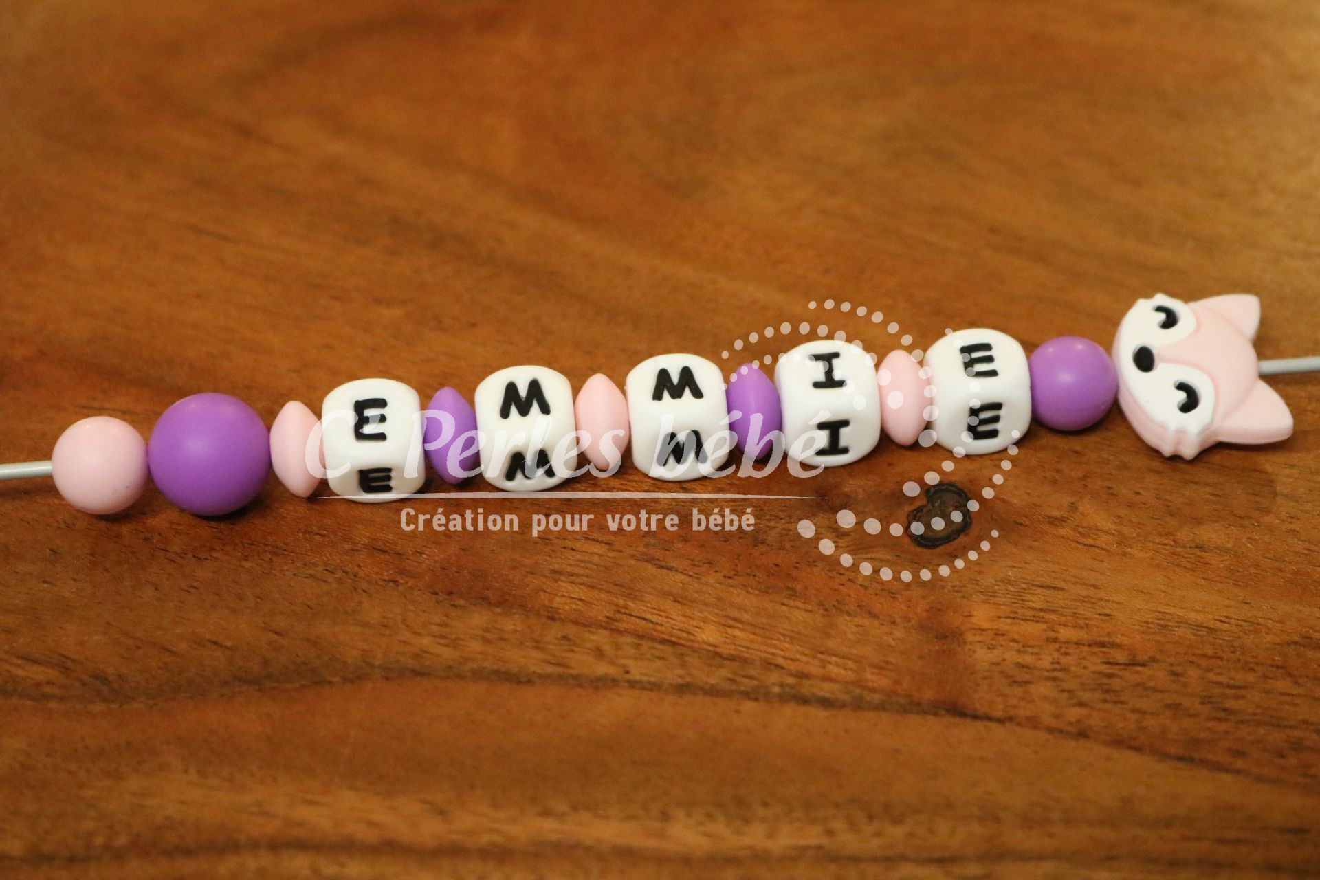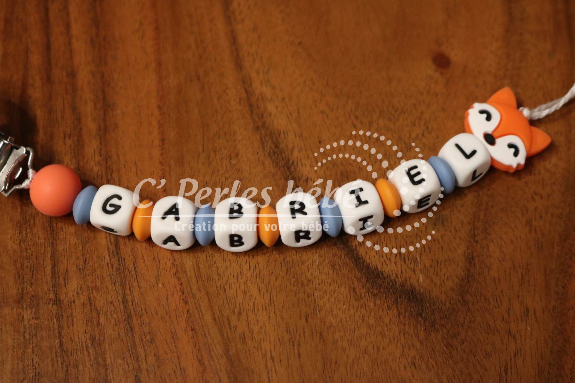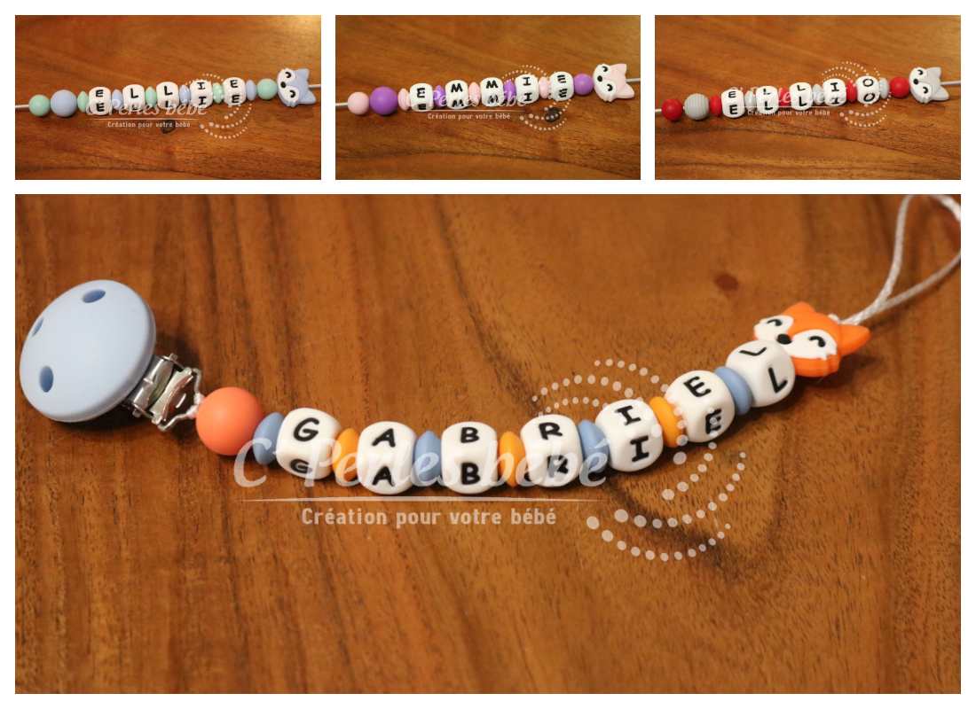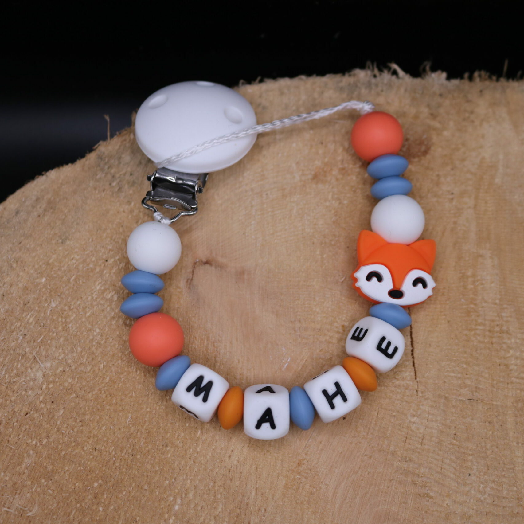 Attache sucette ou attache doudou fait main par mes soins, modèle renard entièrement personnalisable. Perles en silicone, longueur max 22 cm (respect des normes de sécurité en vigueur). Adaptateur tétine MAM en option.