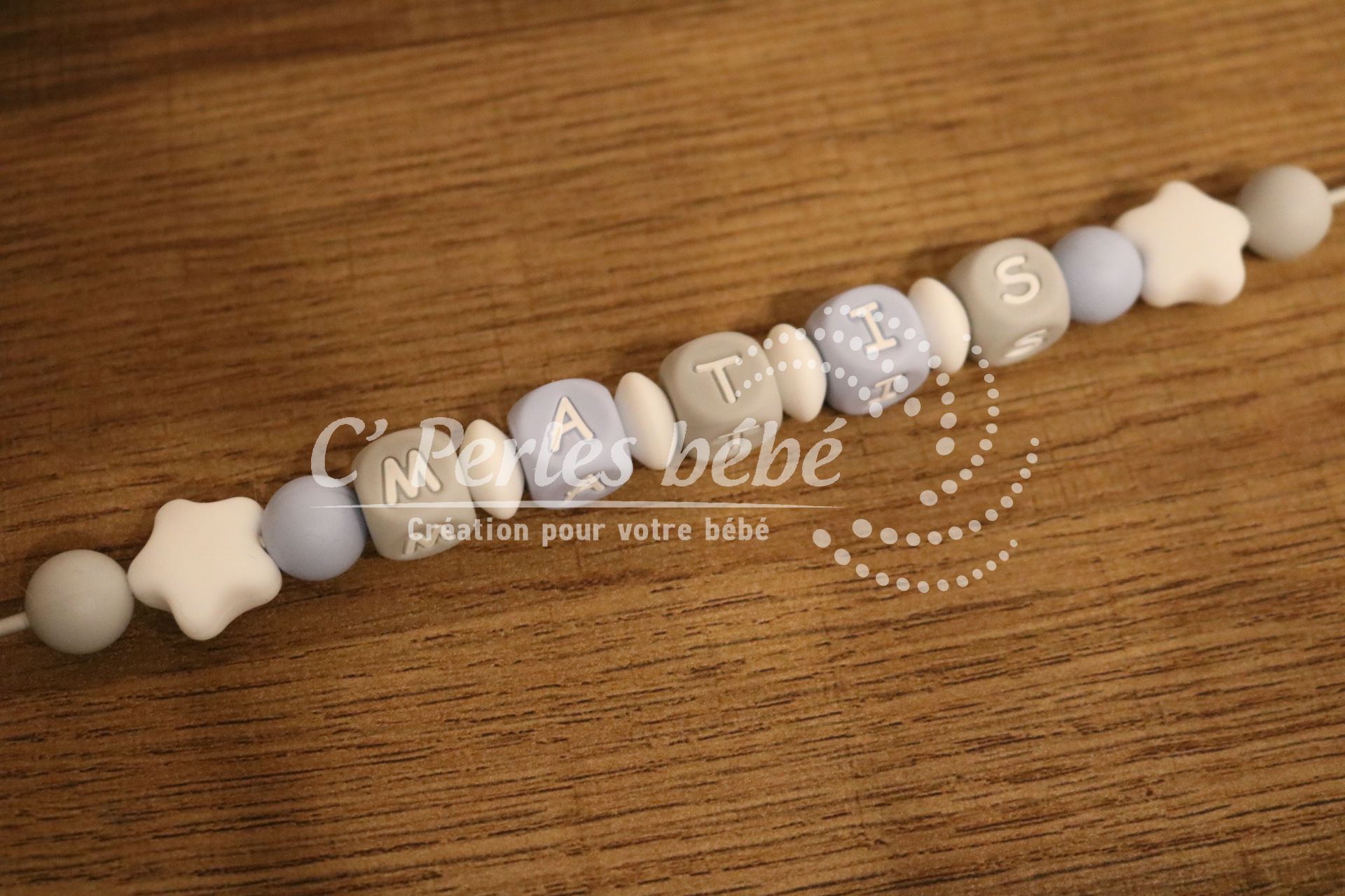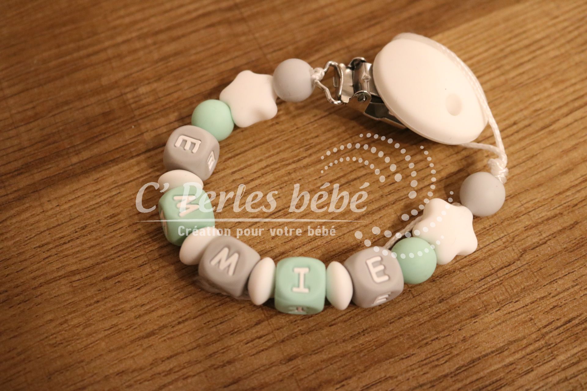 Attache sucette fait main par mes soins, entièrement personnalisable, modèle bicolore. Perles en silicone, longueur max 22 cm (respect des normes de sécurité en vigueur). Adaptateur tétine MAM en option.