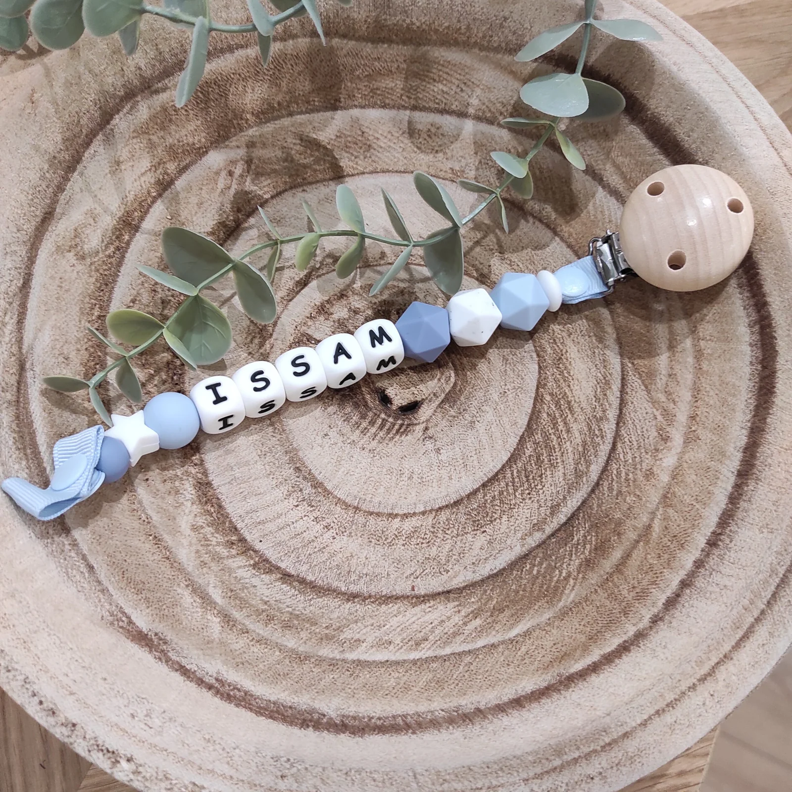 Modèle simple d’utilisation: L’attache tétine s’attache à l’anneau de la tétine grâce à un système de boutons pression.