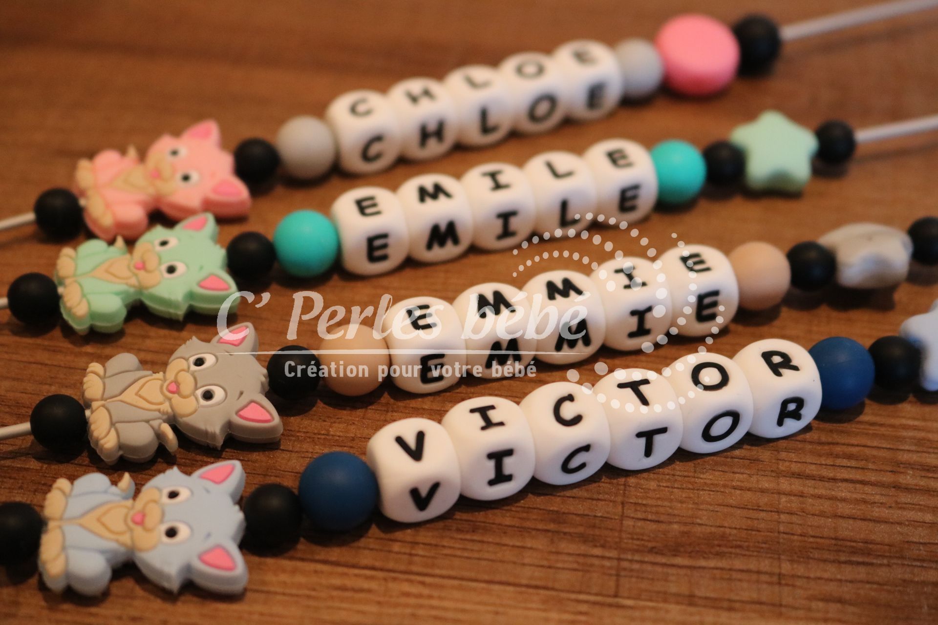 Attache sucette fait main par mes soins, modèle chat entièrement personnalisable. Perles en silicone, longueur max 22 cm (respect des normes de sécurité en vigueur). Adaptateur tétine MAM en option.