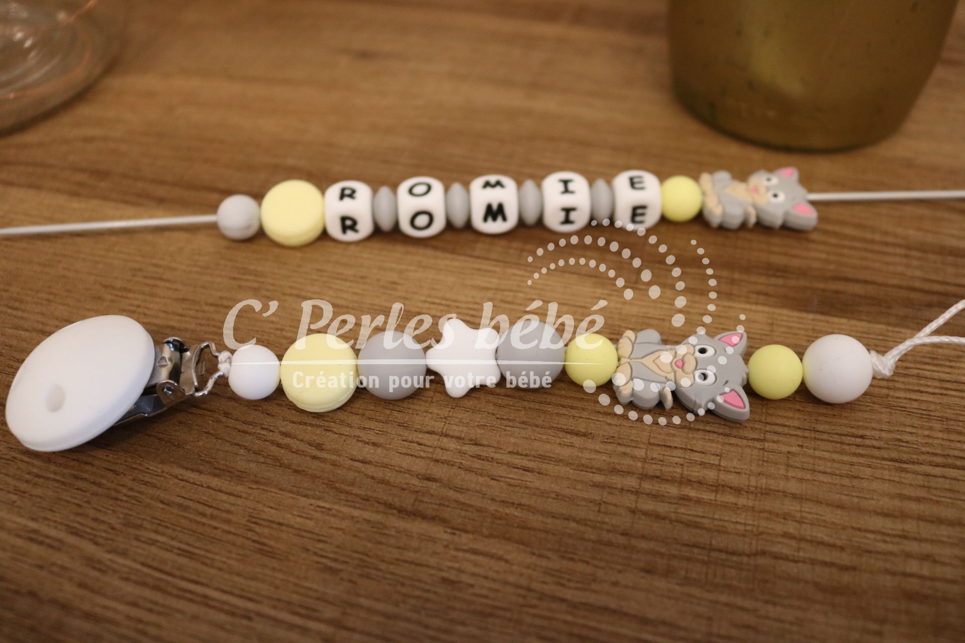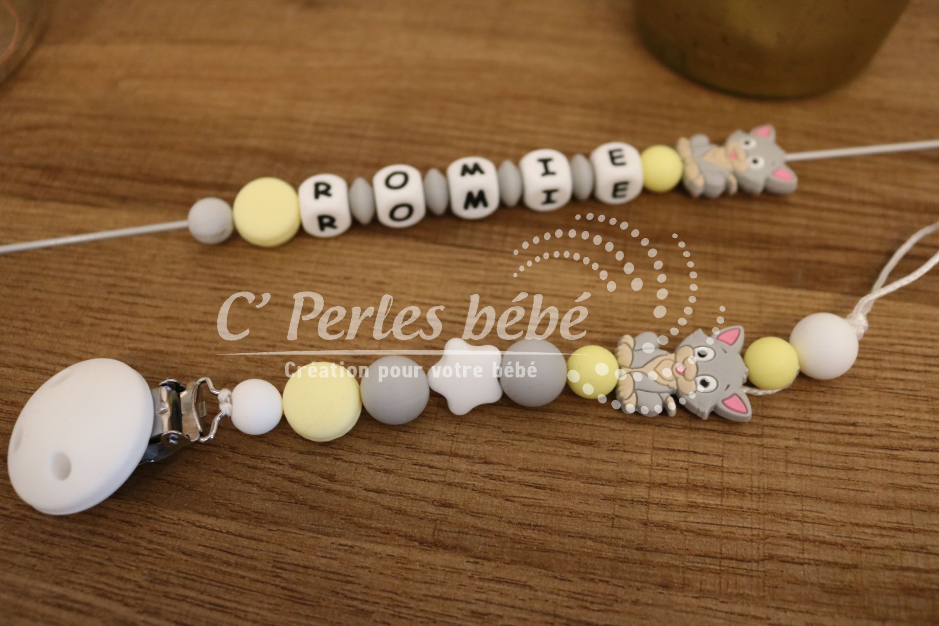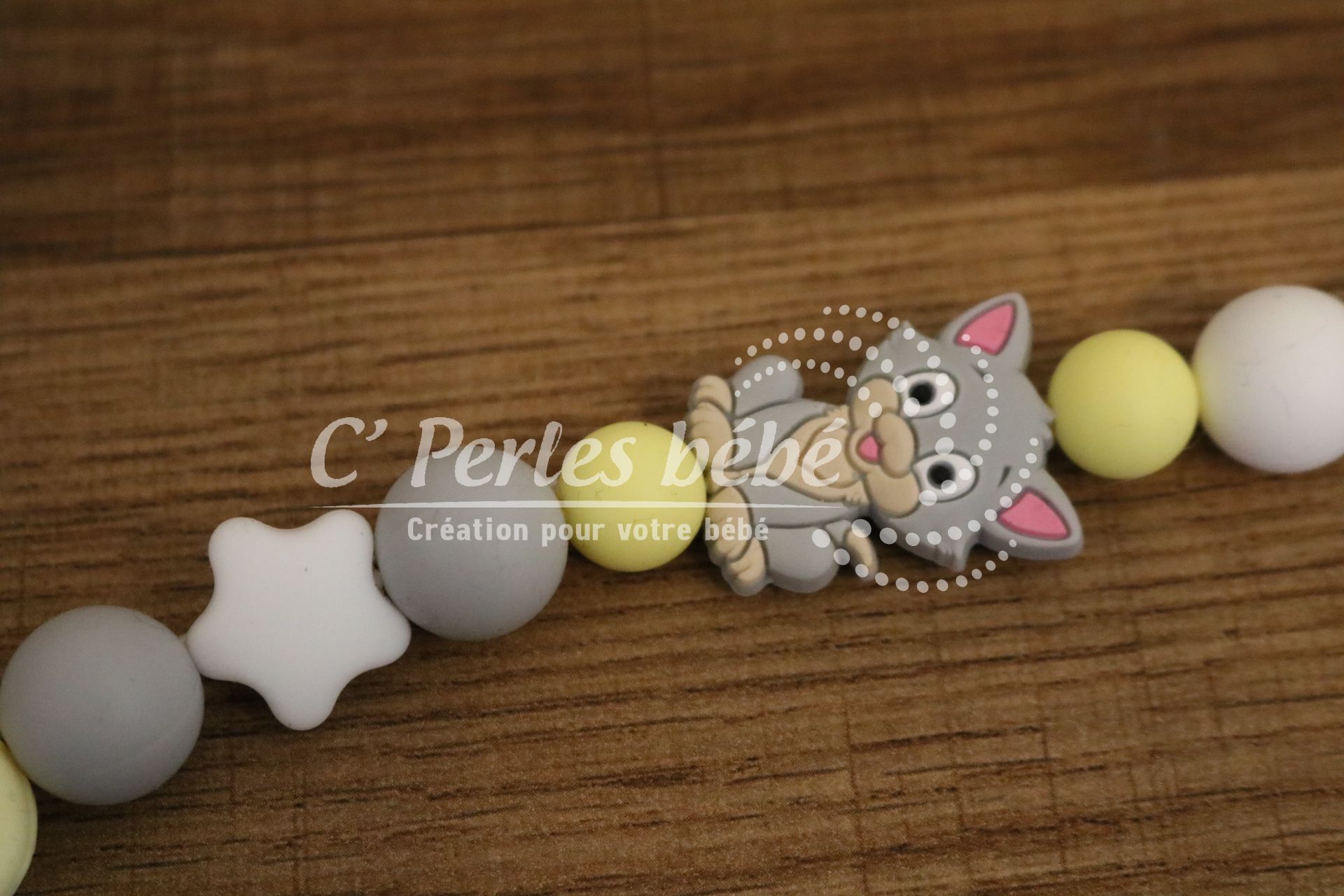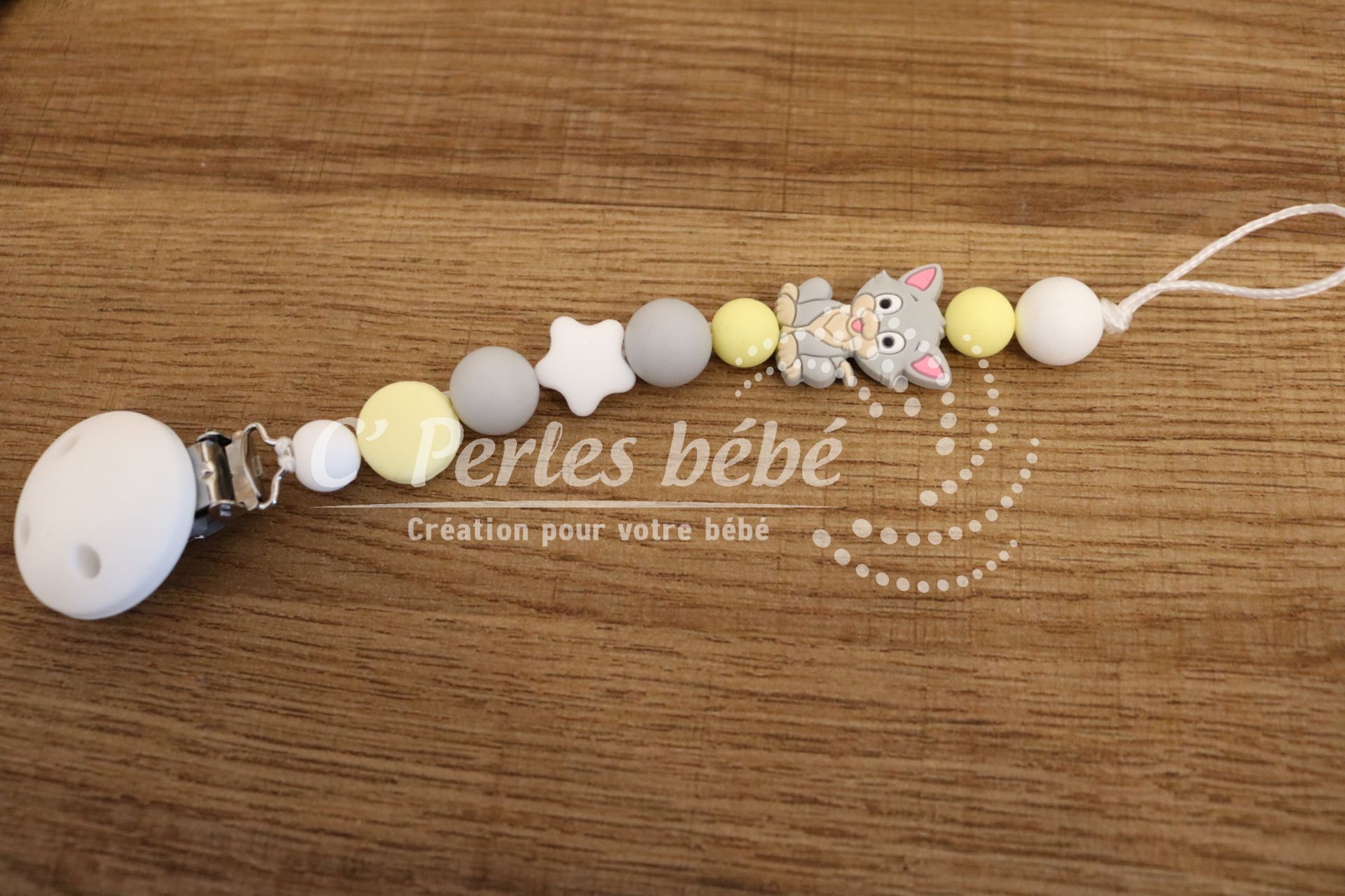 Attache sucette fait main par mes soins, modèle chaton entièrement personnalisable. Perles en silicone, longueur max 22 cm (respect des normes de sécurité en vigueur). Adaptateur tétine MAM en option.