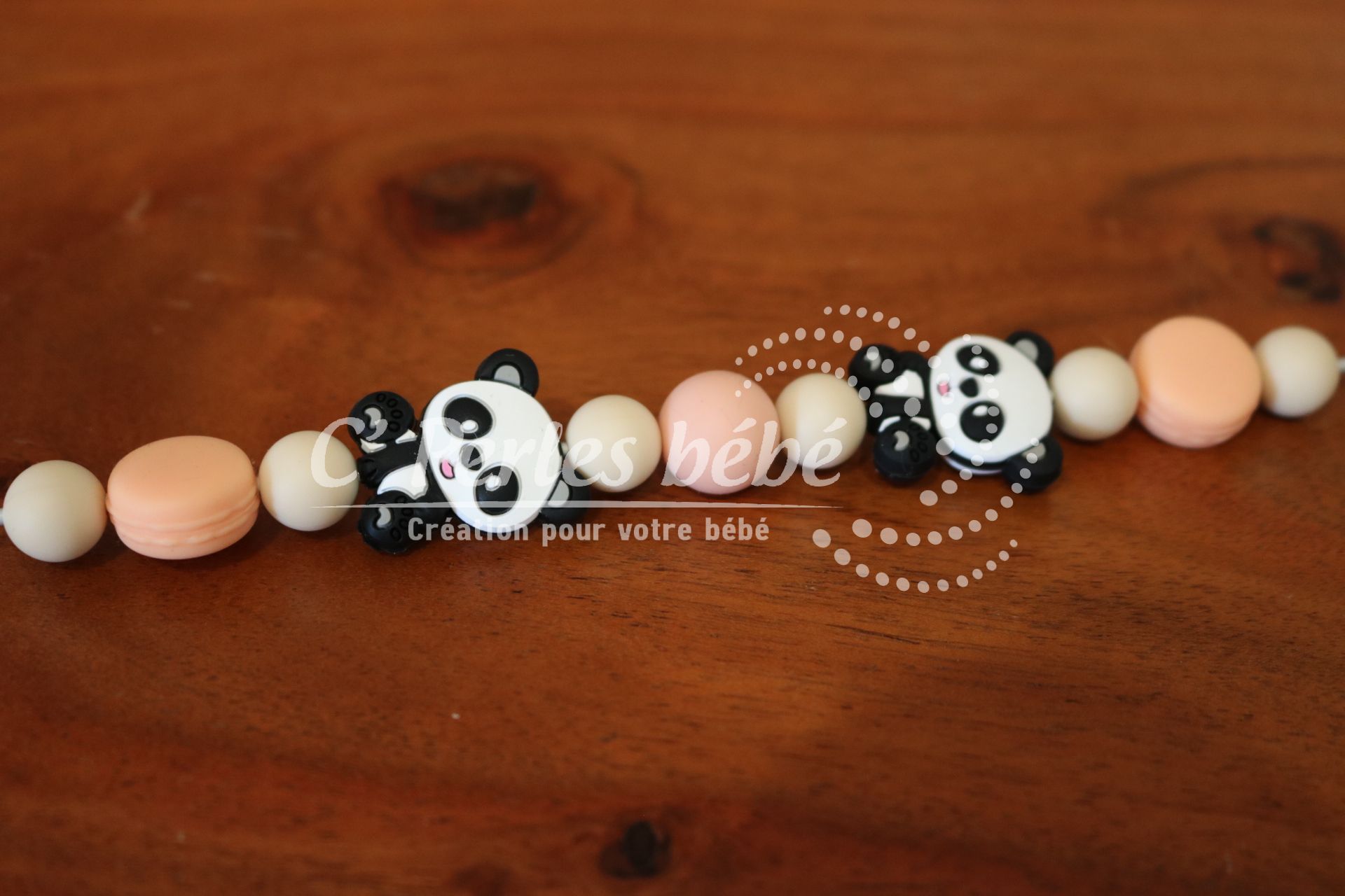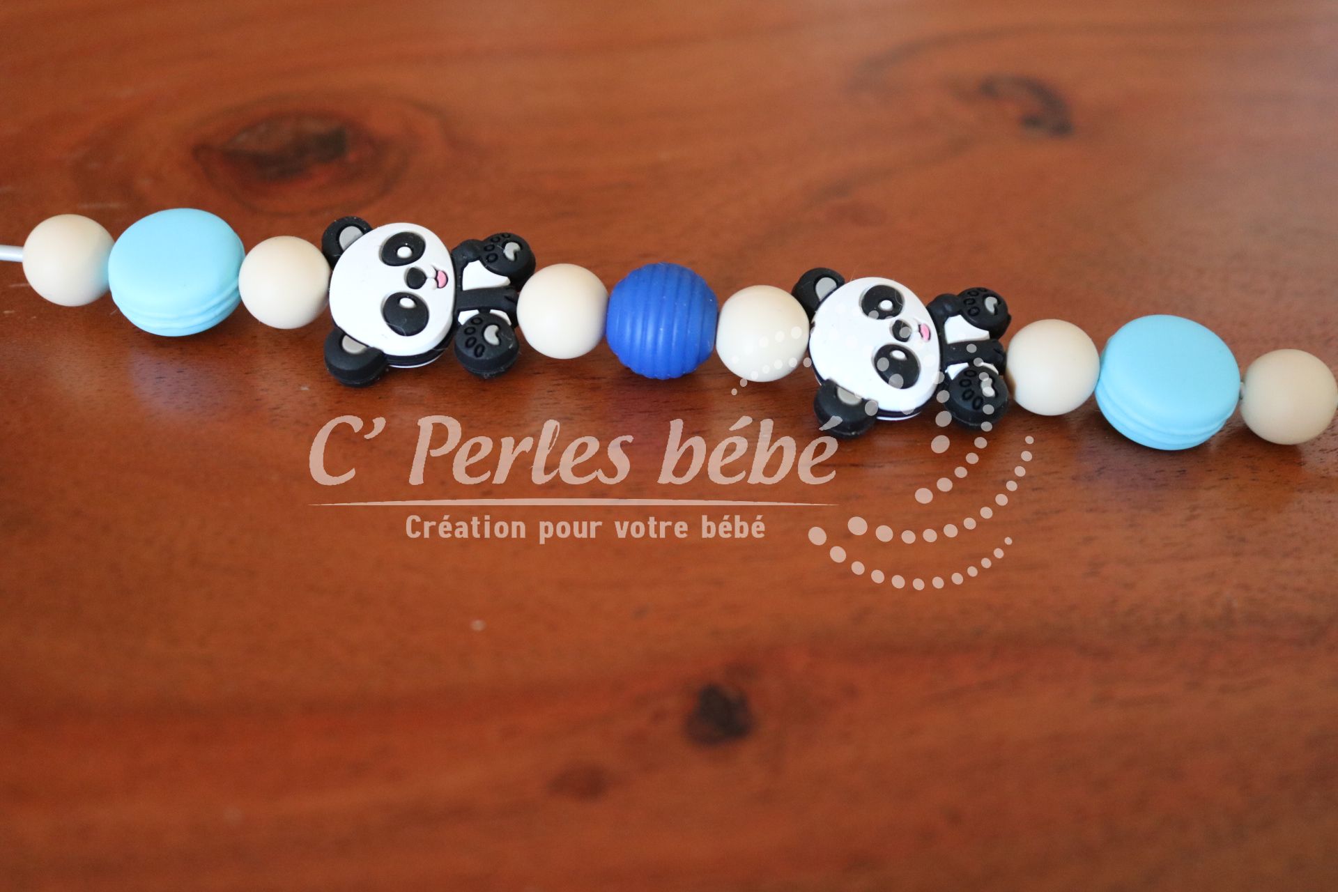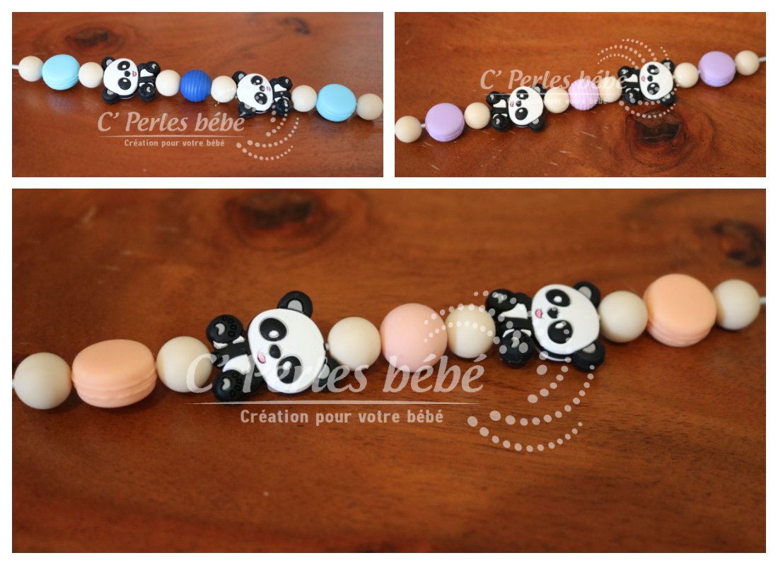 Attache sucette fait main par mes soins, modèle classique panda entièrement personnalisable. Perles en silicone, longueur max 22 cm (respect des normes de sécurité en vigueur). Adaptateur tétine MAM en option. Disponible en version accroche tétine ou attache doudou.