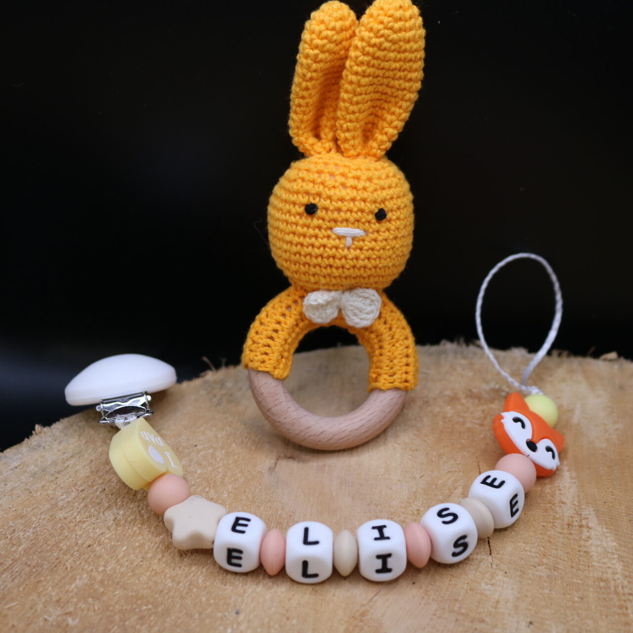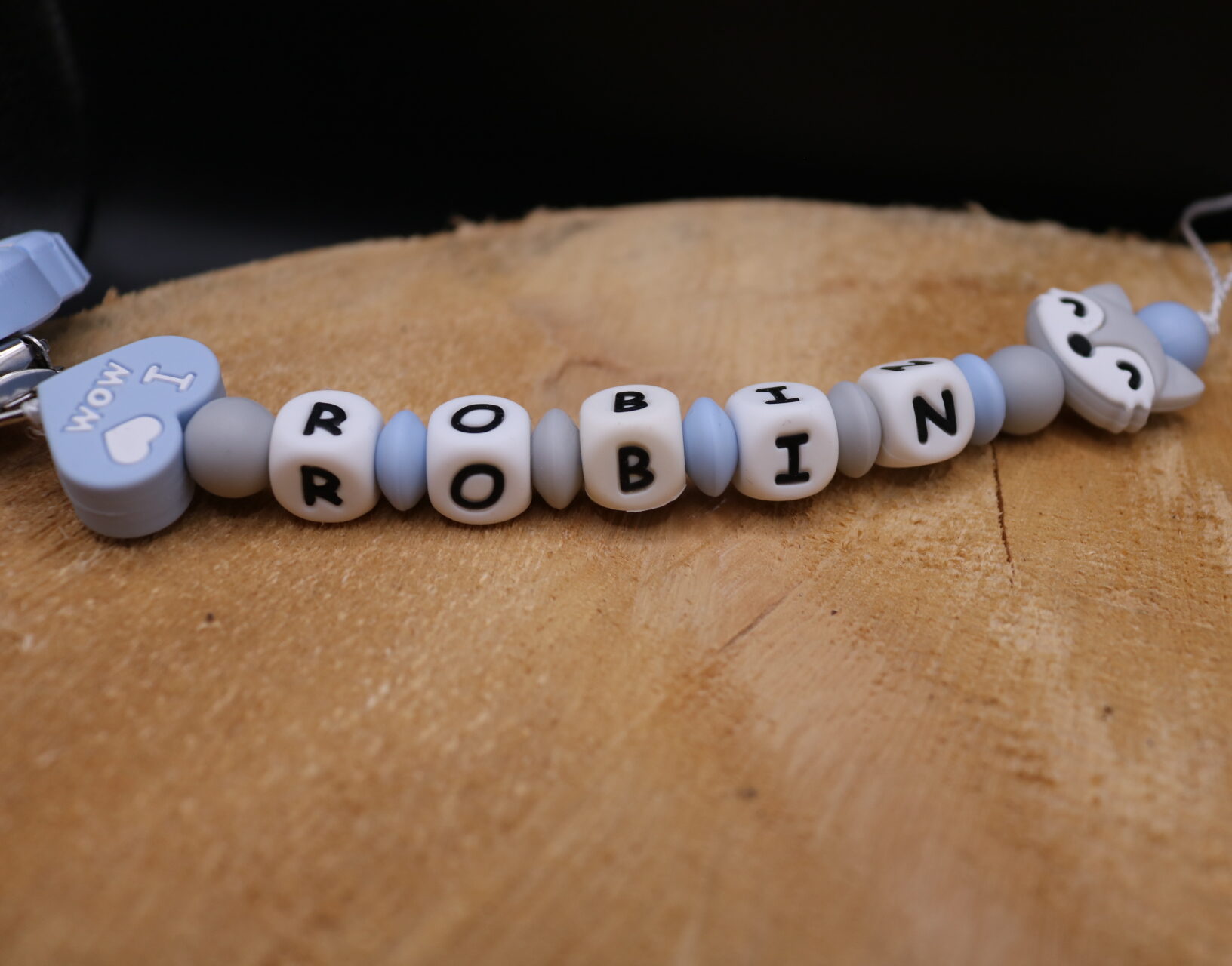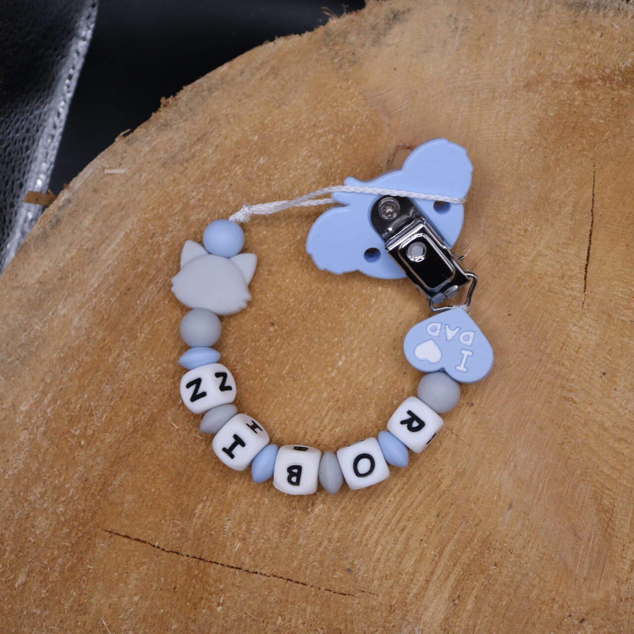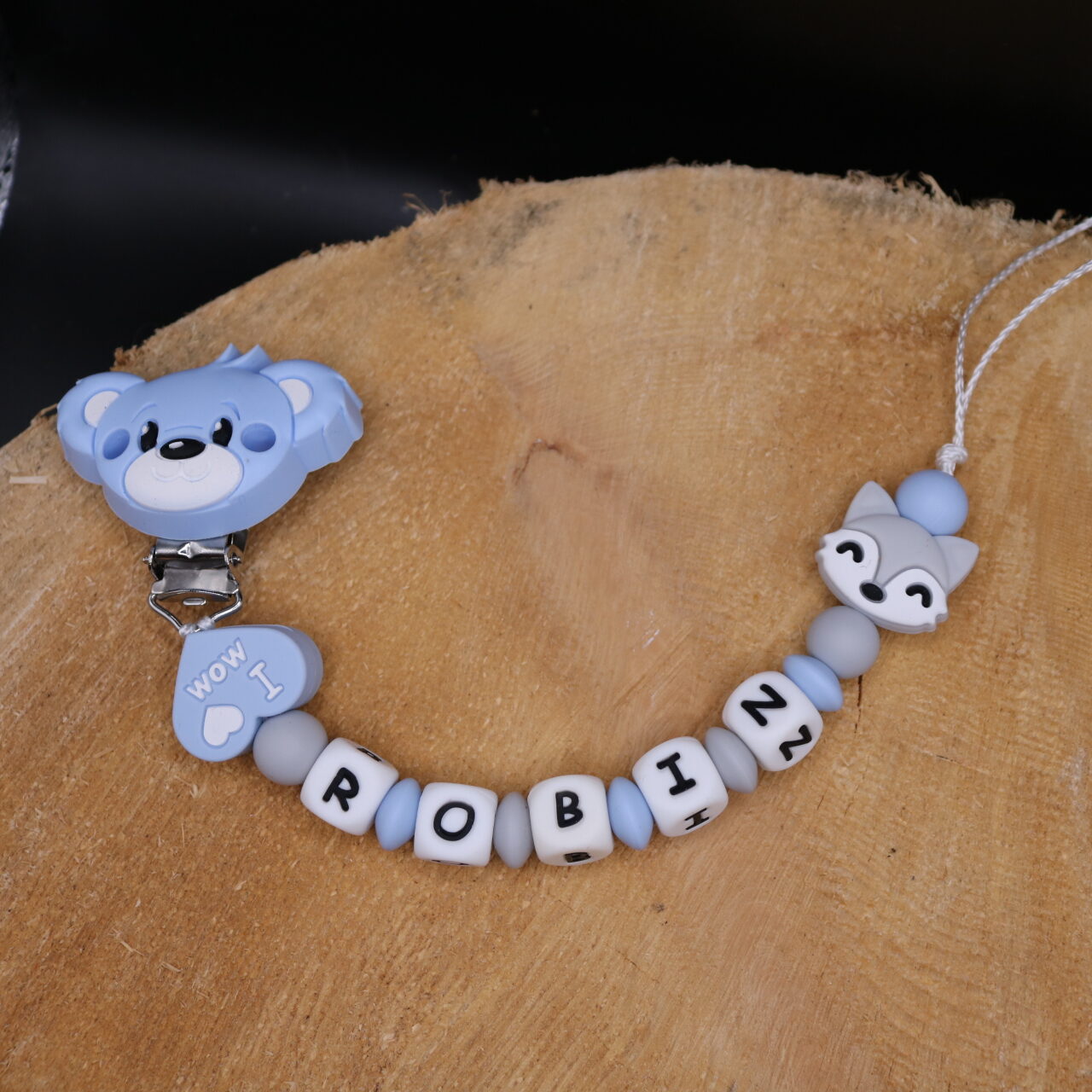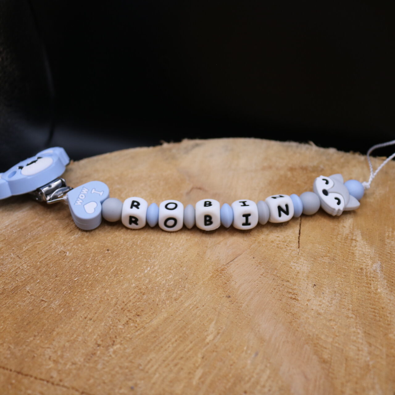 Attache sucette fait main par mes soins, modèle coeur renard entièrement personnalisable. Perles en silicone, longueur max 22 cm (respect des normes de sécurité en vigueur). Adaptateur tétine MAM en option. Egalement disponible en version attache doudou. Possible en d’autres coloris, suivant vos envies, contactez moi.