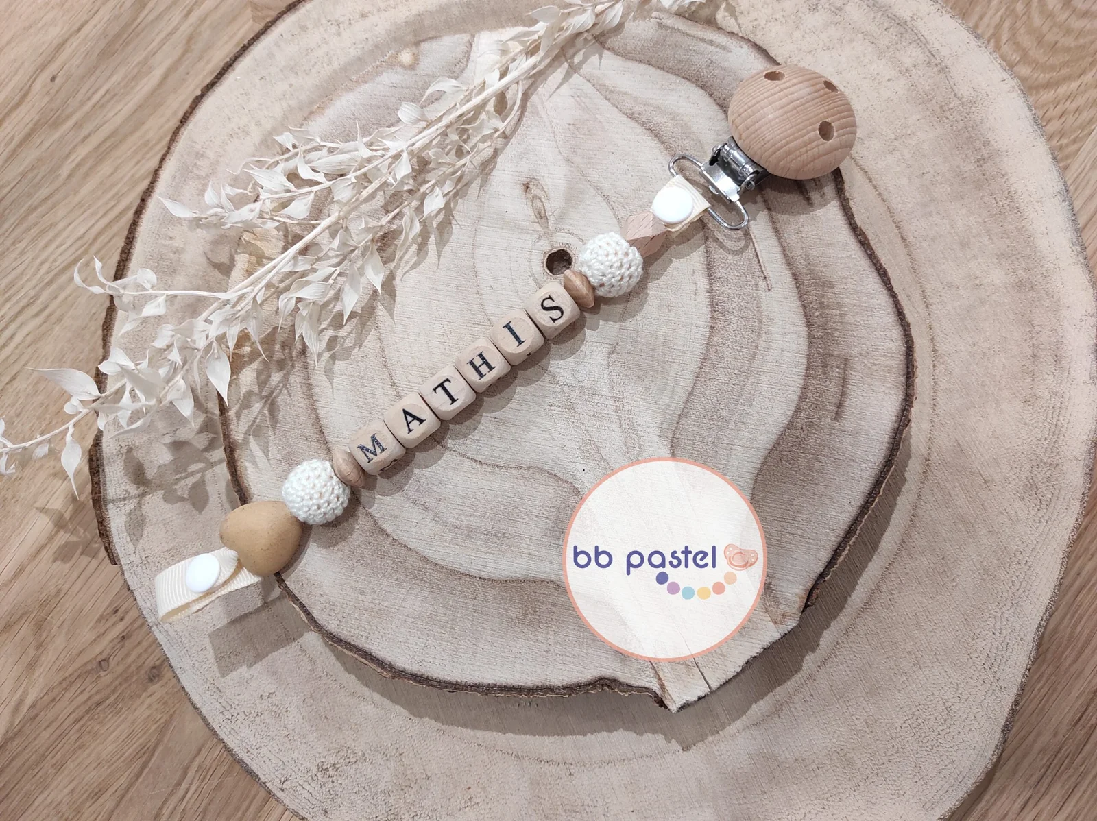 Modèle simple d’utilisation: L’attache tétine s’attache à l’anneau de la tétine grâce à un système de boutons pression.