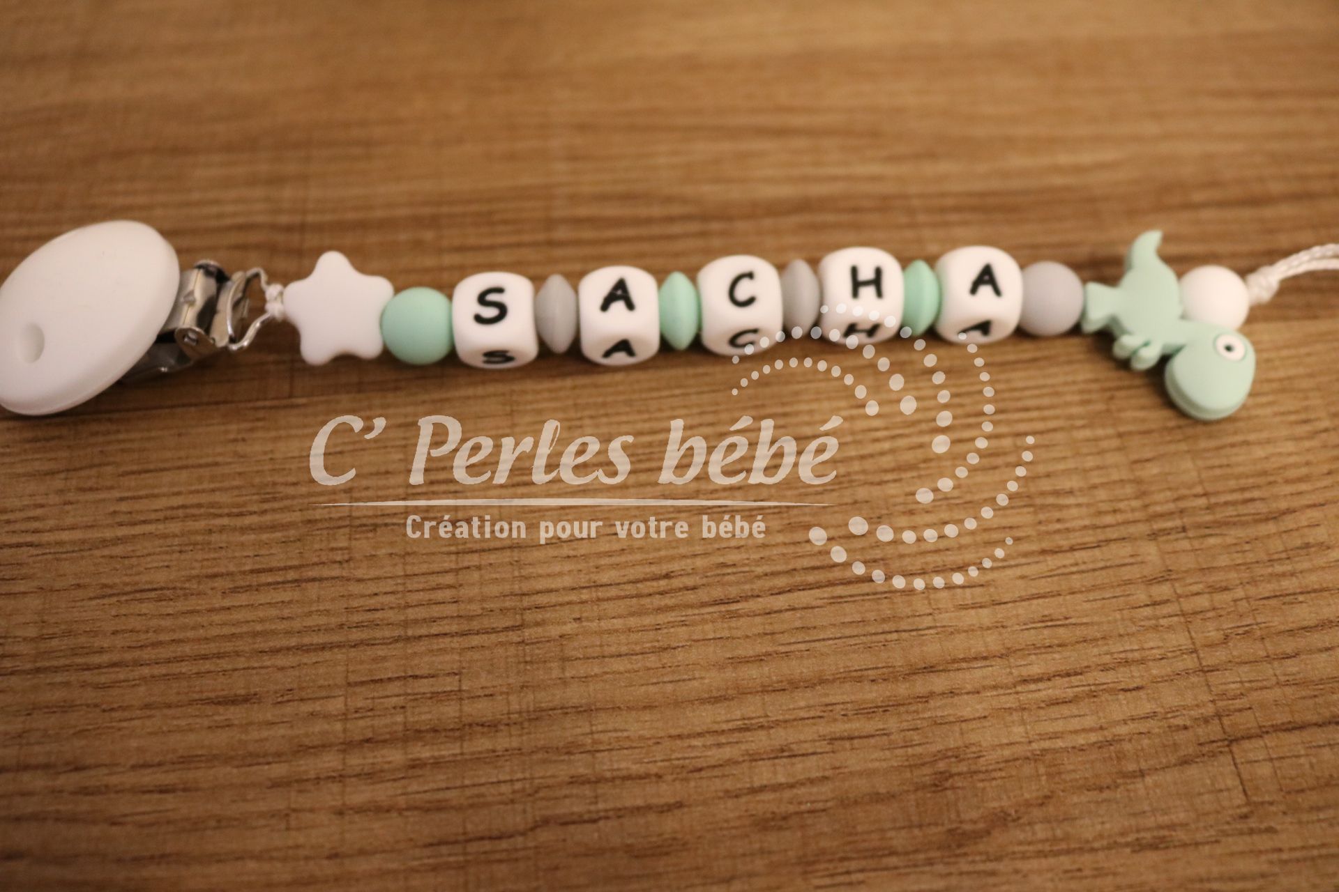 Attache sucette fait main par mes soins, modèle Dinosaure entièrement personnalisable. Perles en silicone, longueur max 22 cm (respect des normes de sécurité en vigueur). Adaptateur tétine MAM en option.