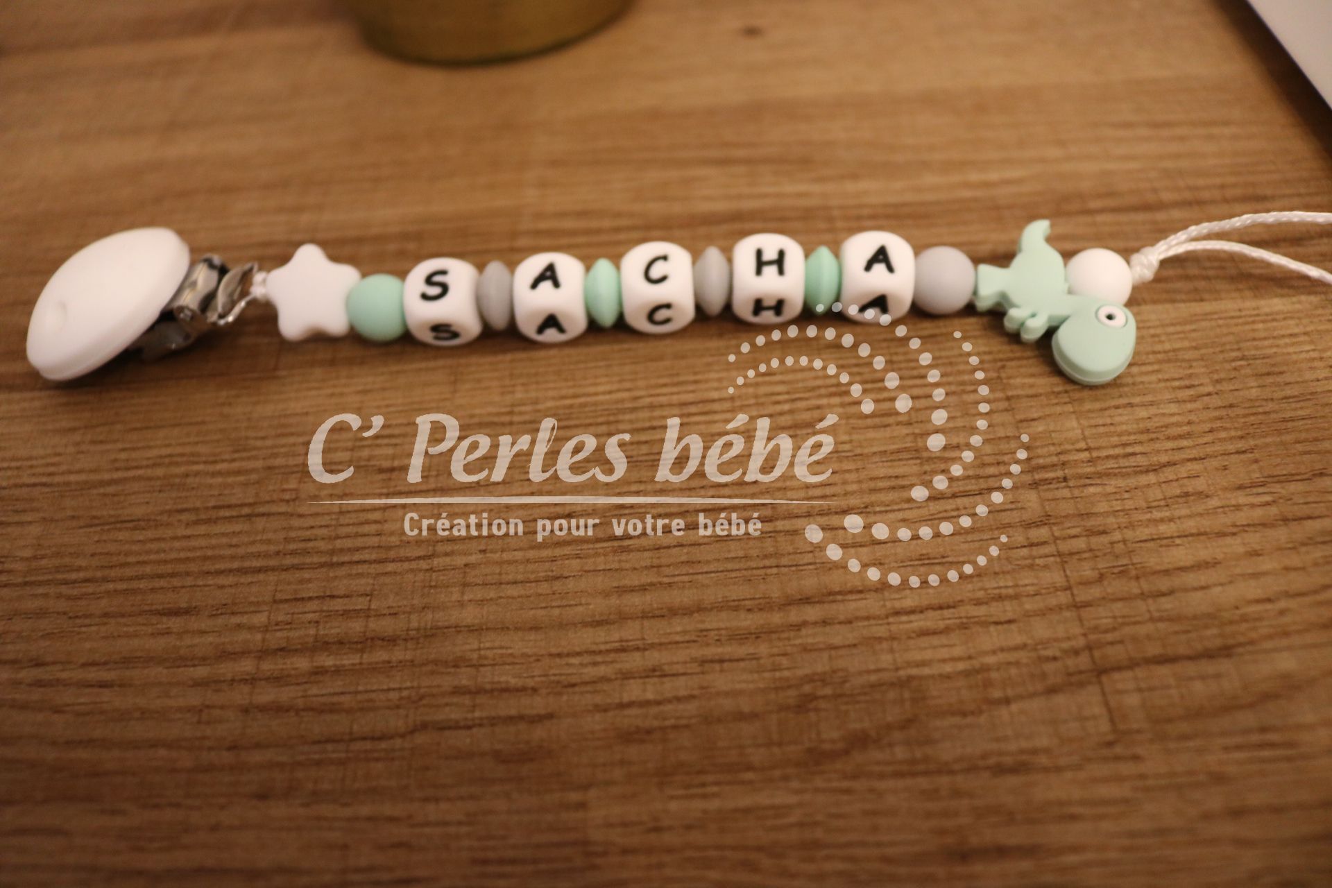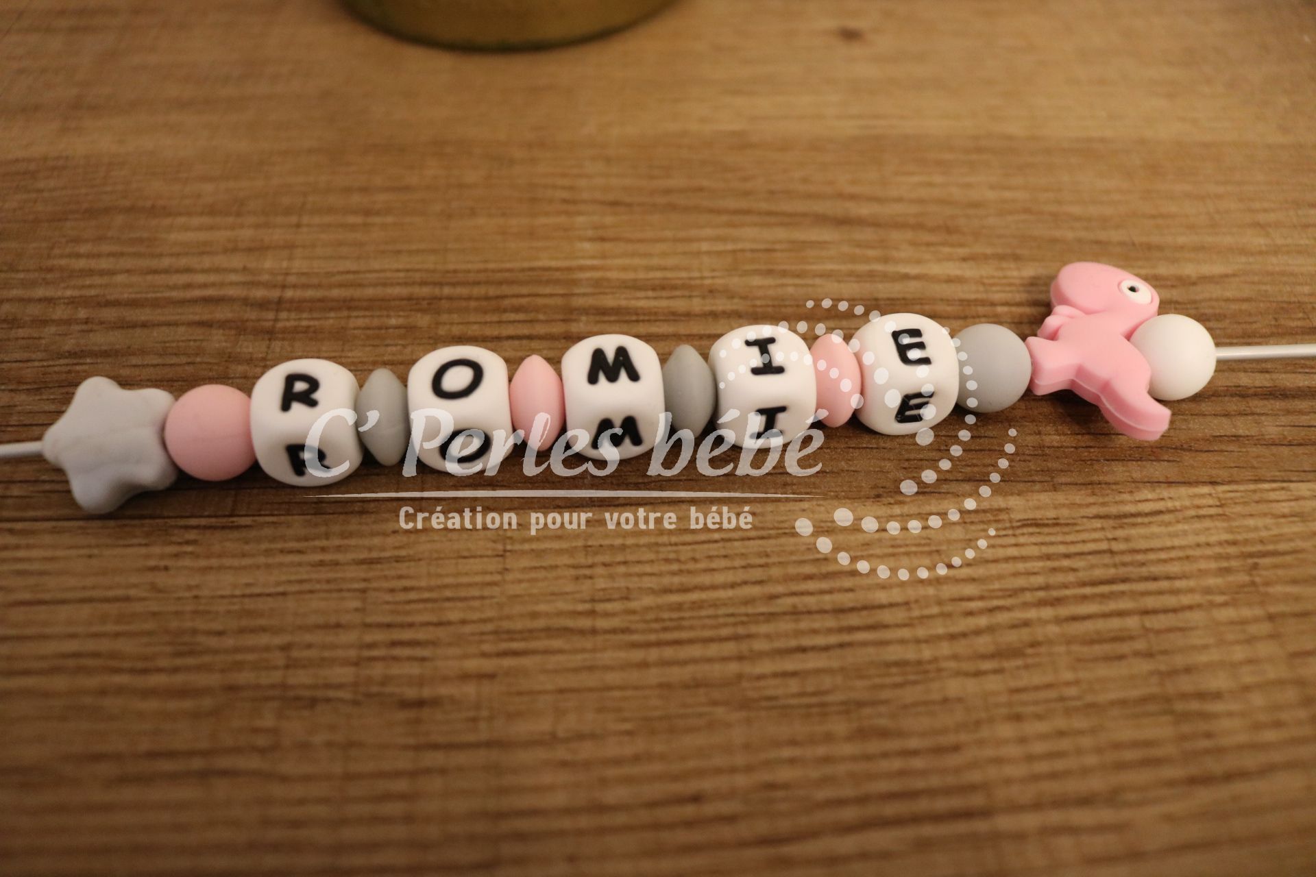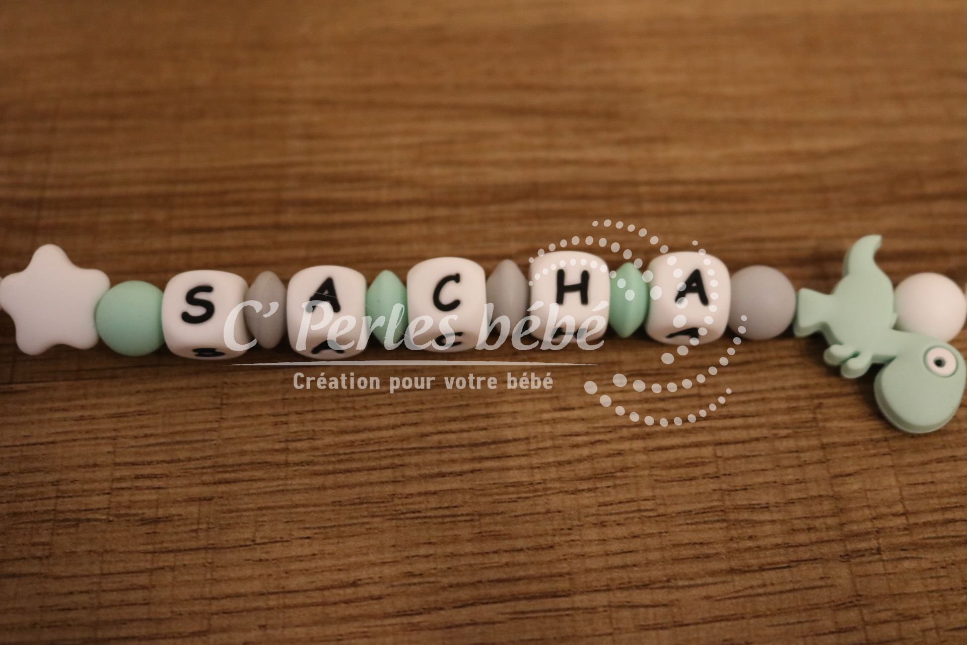Ce modèle 100% silicone comporte des perles lettres et une perle dinosaure.