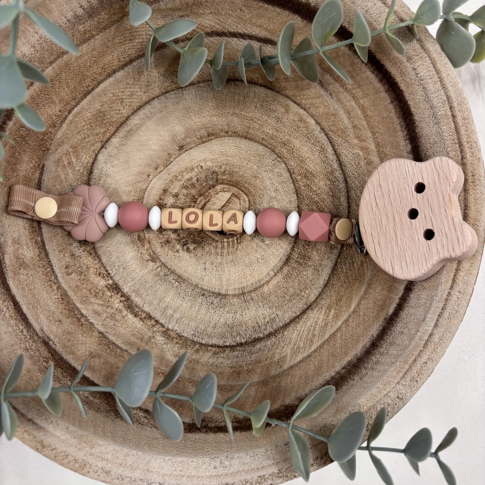 Attache tétine fantaisie avec clip en bois de hêtre, perles en silicone alimentaire et motif feuille romantique. Personnalisable avec le prénom de bébé. Testée en laboratoire, conforme aux normes EN71-1 et EN12586. Longueur inférieure à 22 cm pour une sécurité optimale.