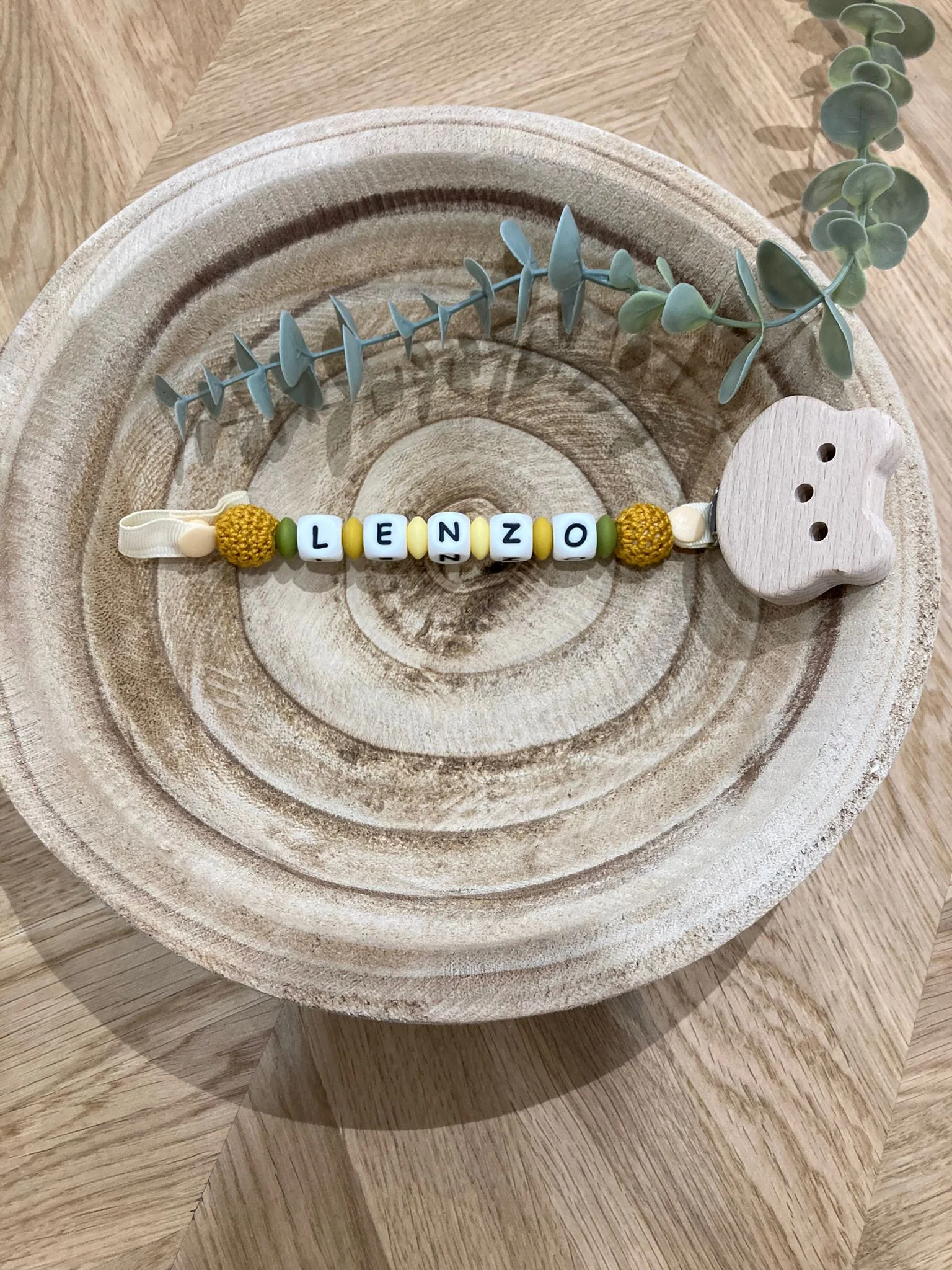 Modèle simple d’utilisation: L’attache jouet s’attache à l’anneau de la tétine grâce à un système de boutons pression.
