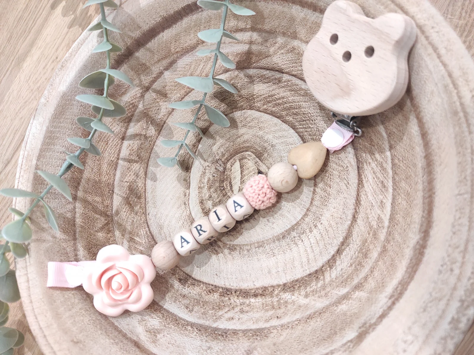 Modèle simple d’utilisation: L’attache jouet s’attache à l’anneau de la tétine grâce à un système de boutons pression.