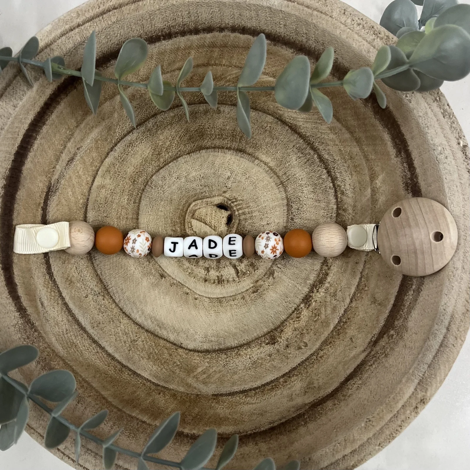 Modèle simple d’utilisation: L’attache tétine s’attache à l’anneau de la tétine grâce à un système de boutons pression.