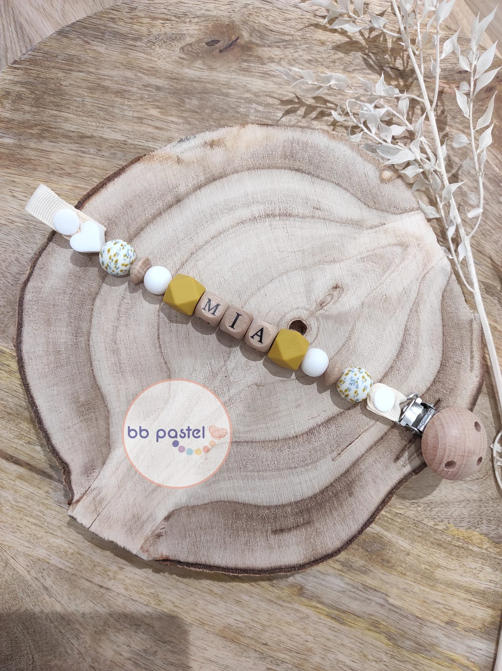 Attache tétine fleurs des champs et jaune moutarde