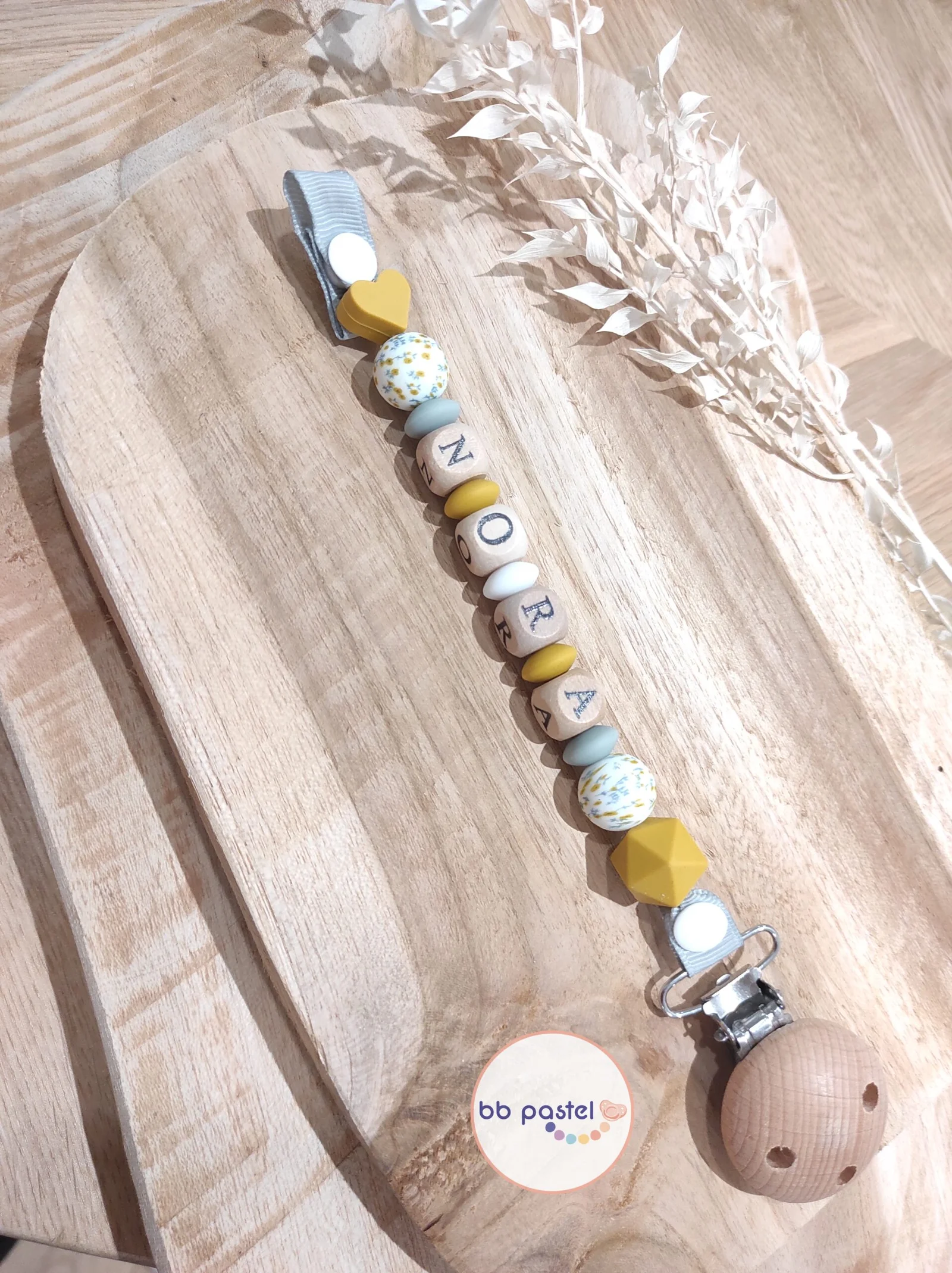 Attache tétine fleurs des champs / jaune moutarde