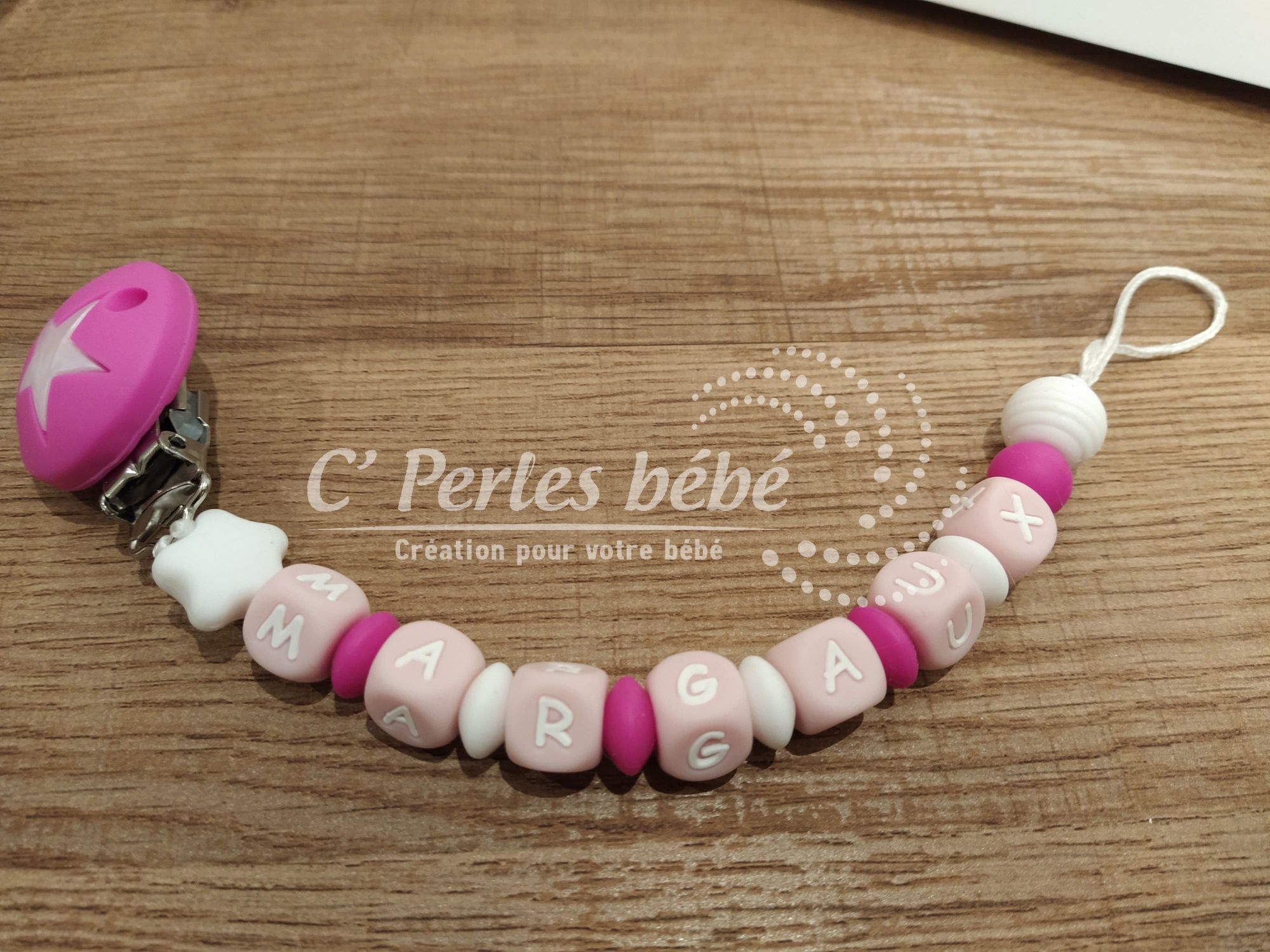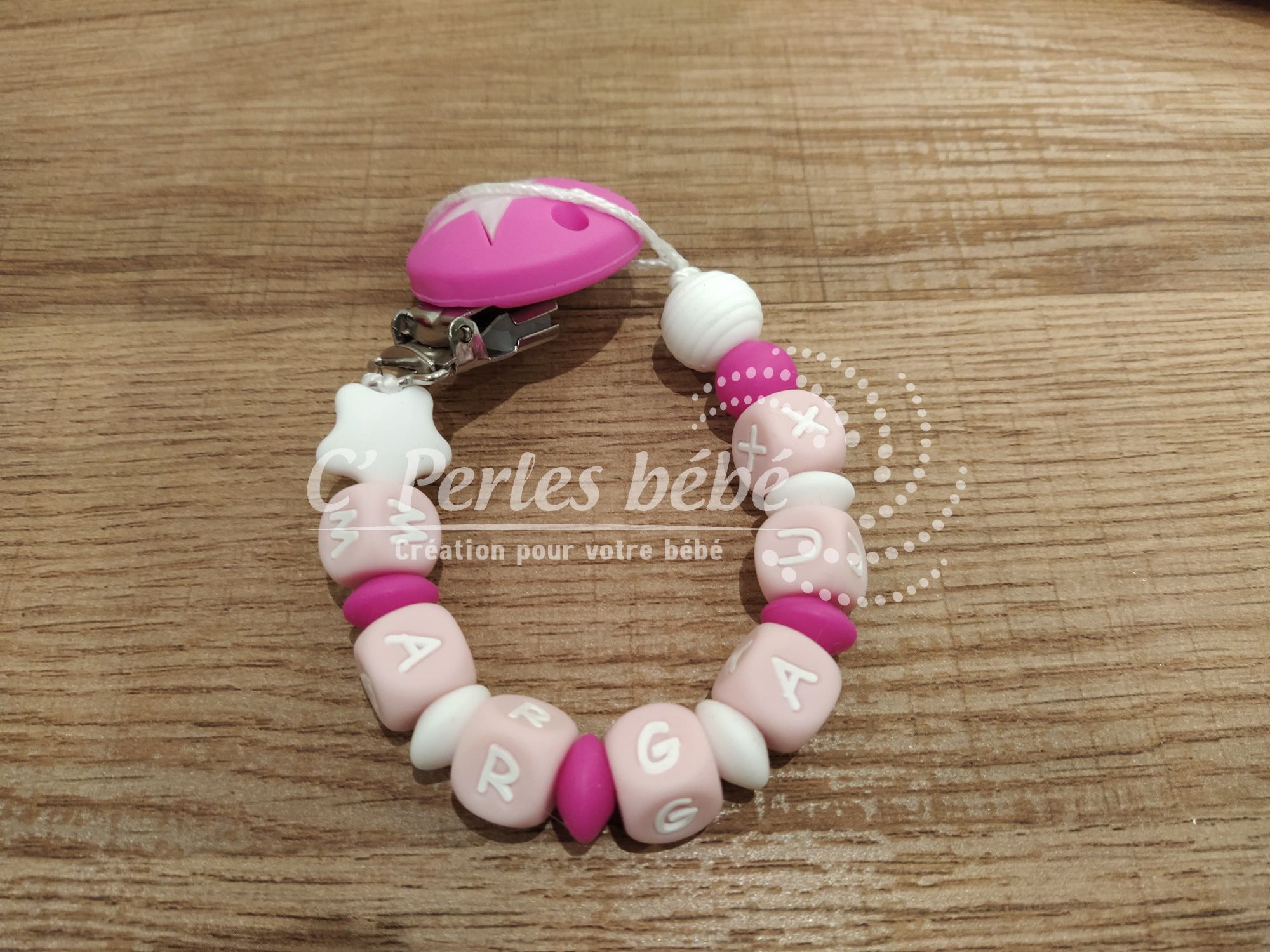 Attache sucette fait main par mes soins, entièrement personnalisable, modèle girly Perles en silicone, longueur max 22 cm (respect des normes de sécurité en vigueur). Adaptateur tétine MAM en option.