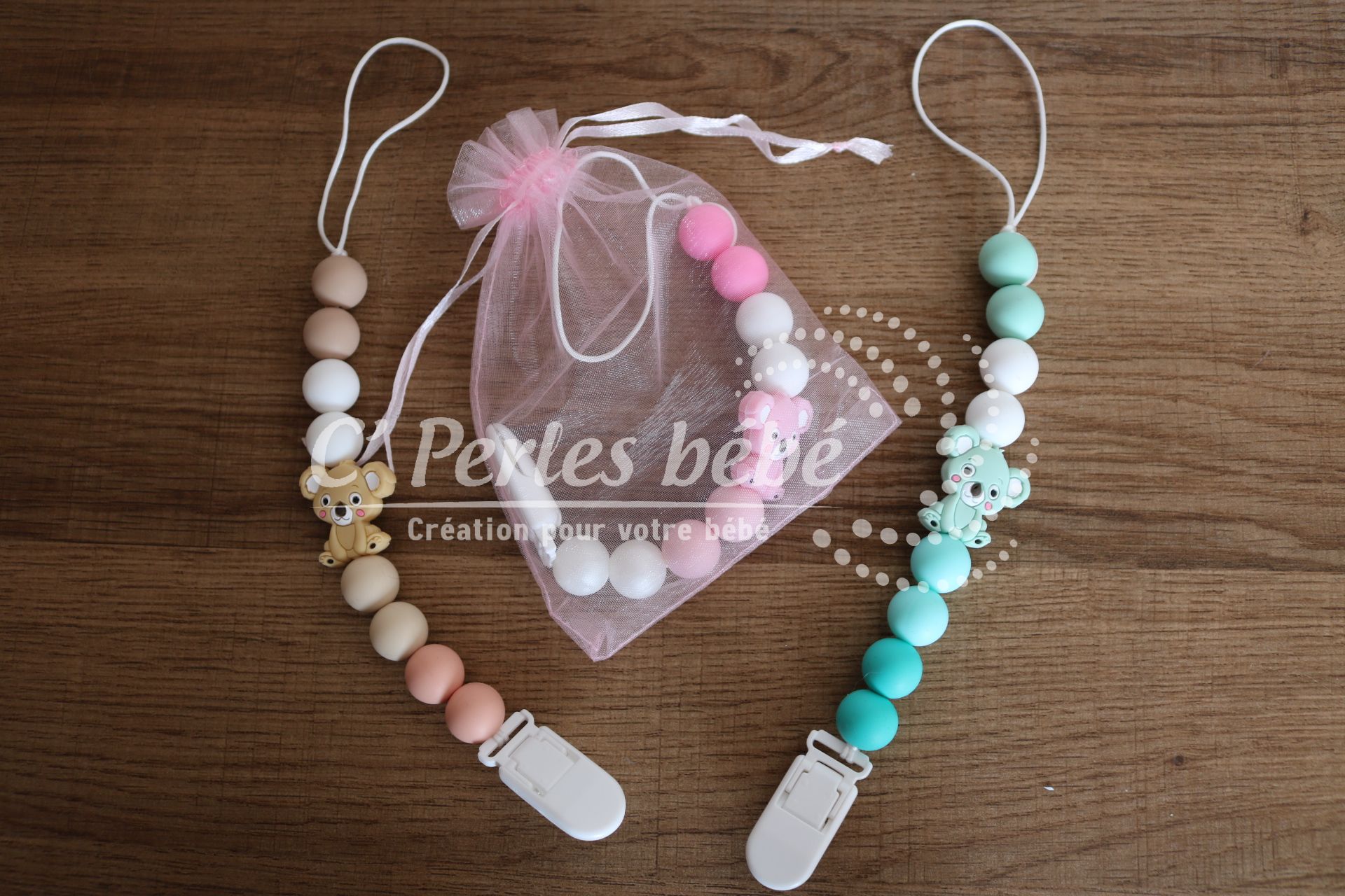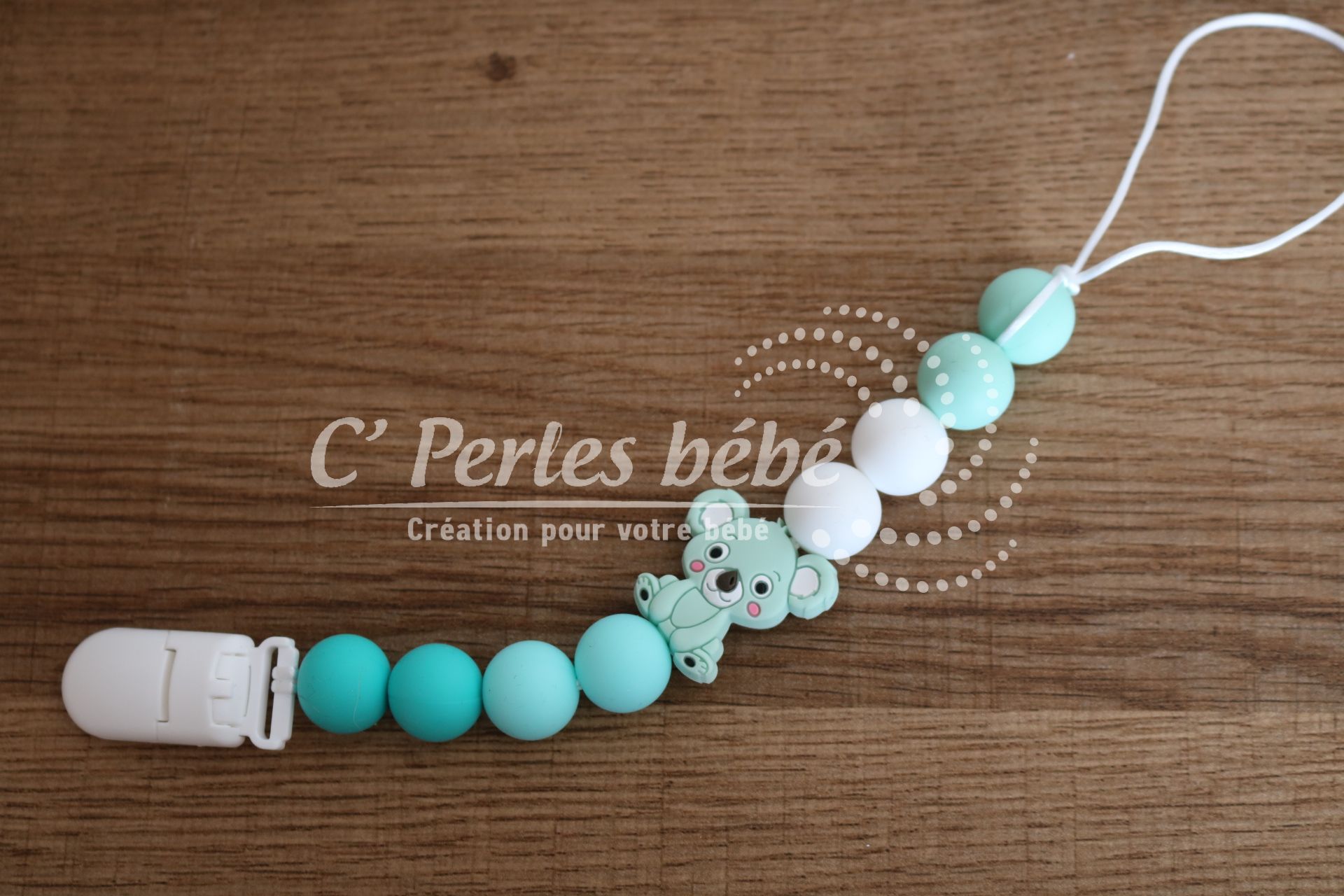 Attache sucette modèle koala Perles en silicone, longueur max 22 cm (respect des normes de sécurité en vigueur). Adaptateur tétine MAM en option.