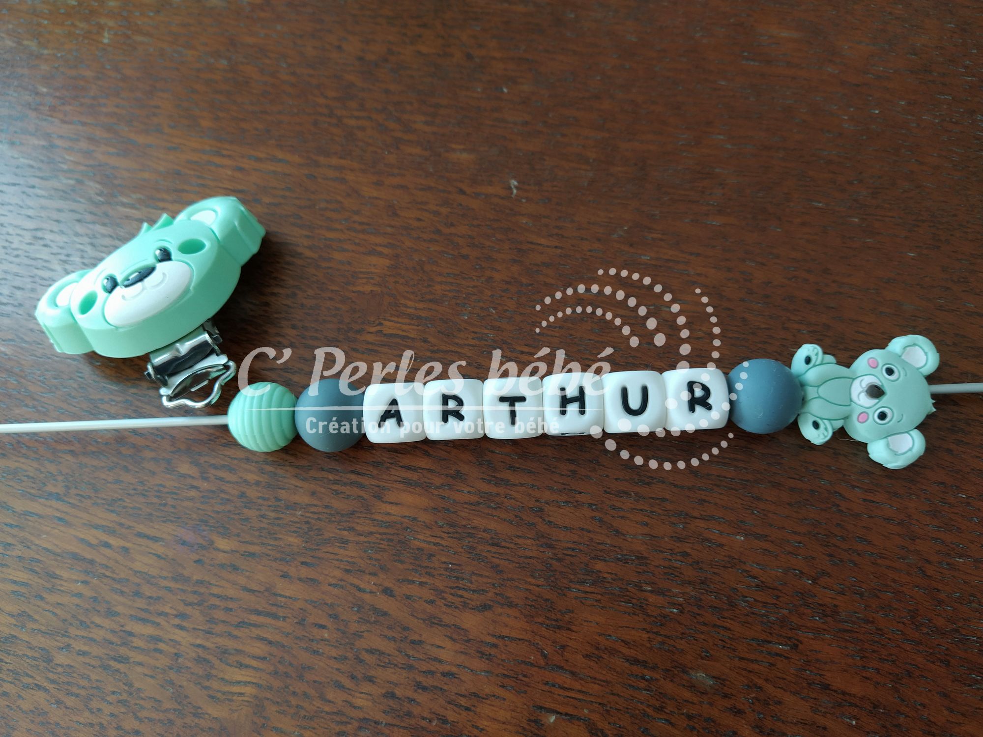 Attache sucette fait main par mes soins, modèle koala, personnalisable sur demande. Perles en silicone, longueur max 22 cm (respect des normes de sécurité en vigueur). Adaptateur tétine MAM en option.