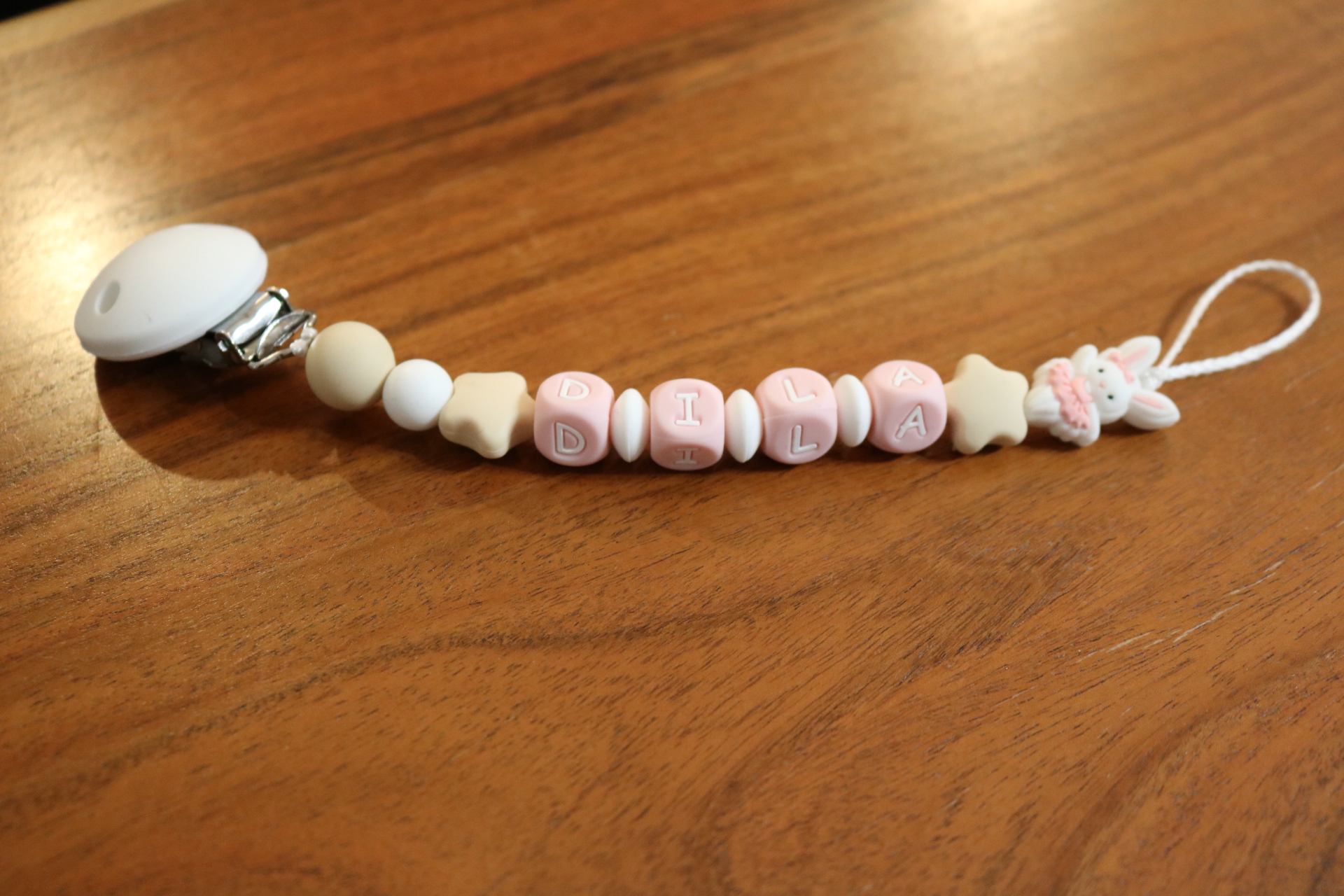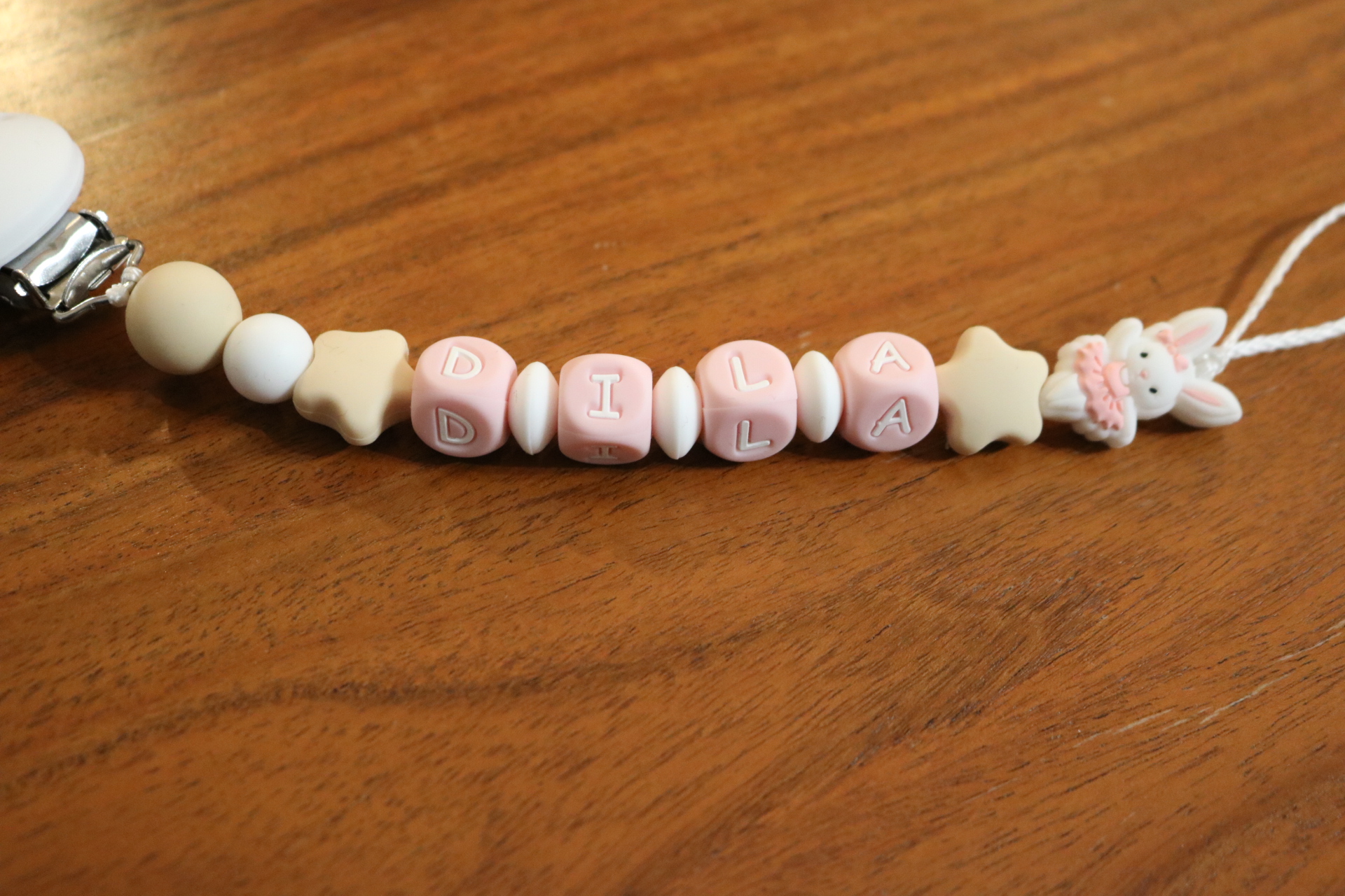 Attache sucette fait main par mes soins, entièrement personnalisable, modèle lapin danseur. Perles en silicone, longueur max 22 cm (respect des normes de sécurité en vigueur). Adaptateur tétine MAM en option.