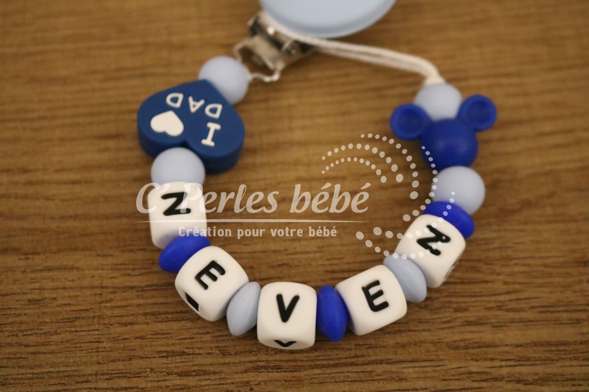 Attache sucette fait main par mes soins, modèle love Mickey entièrement personnalisable. Perles en silicone, longueur max 22 cm (respect des normes de sécurité en vigueur). Adaptateur tétine MAM en option. Disponible également en version attache doudou (clip à chaque extrémité).