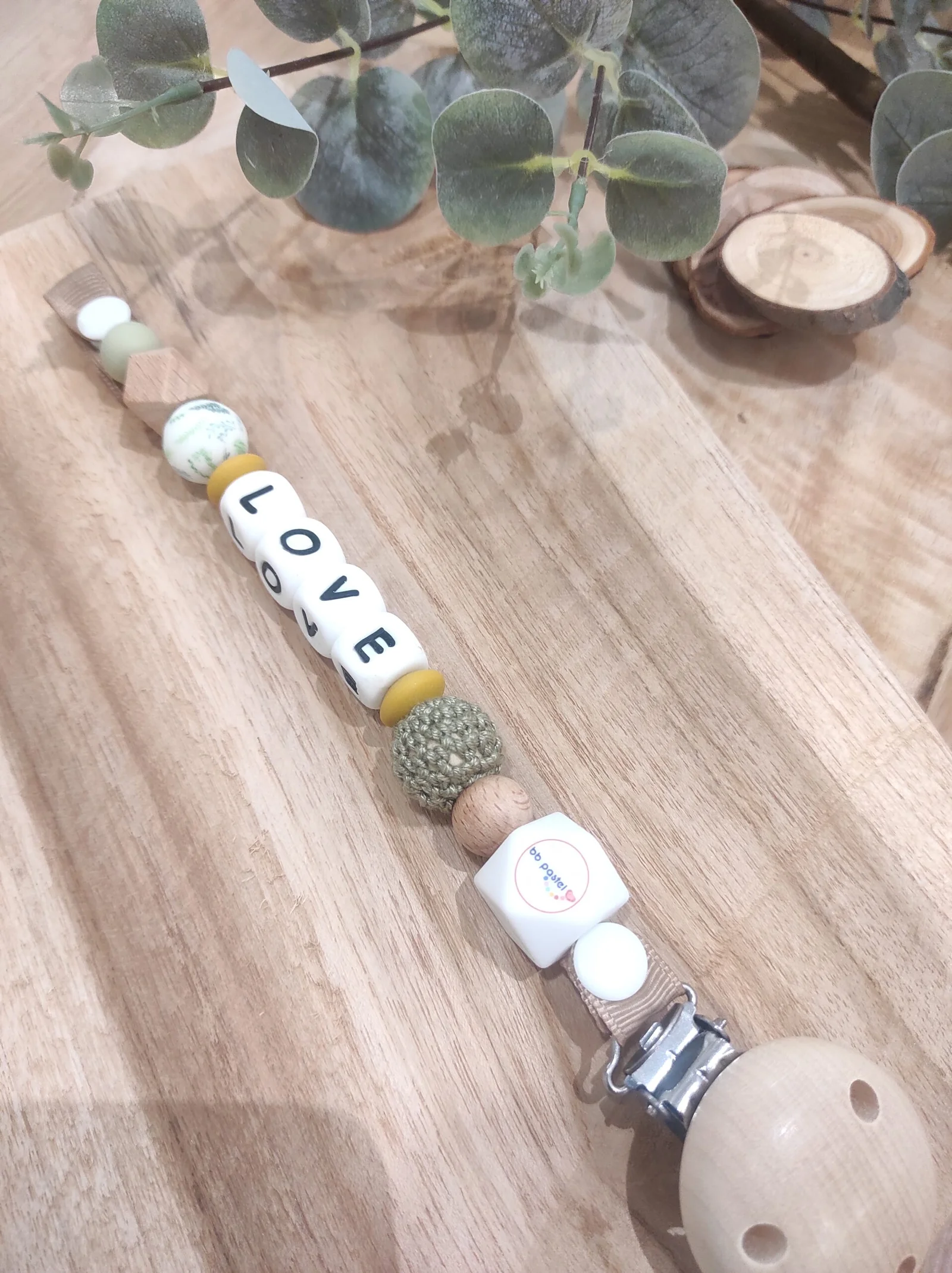 Modèle simple d’utilisation: L’attache tétine s’attache à l’anneau de la tétine grâce à un système de boutons pression.