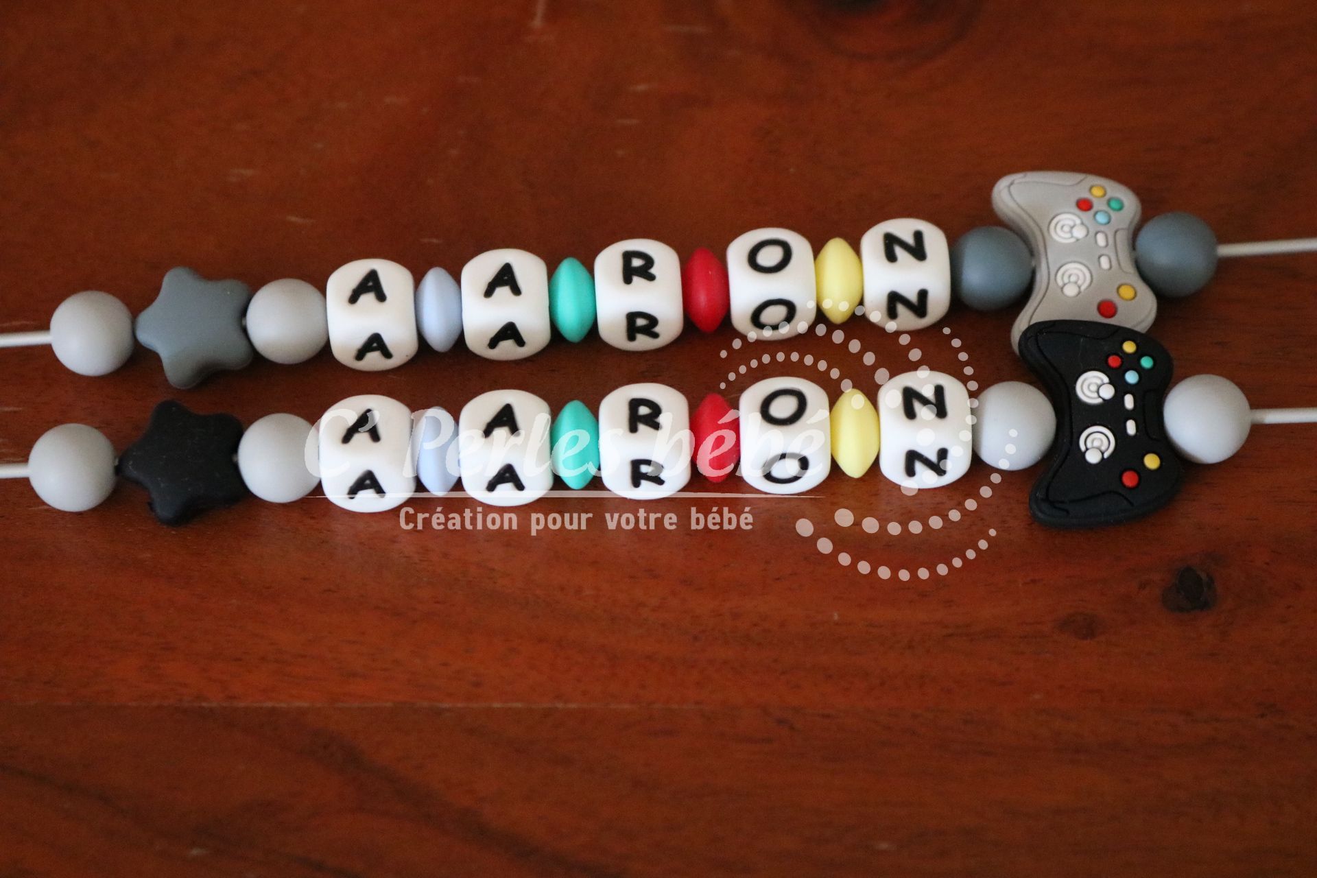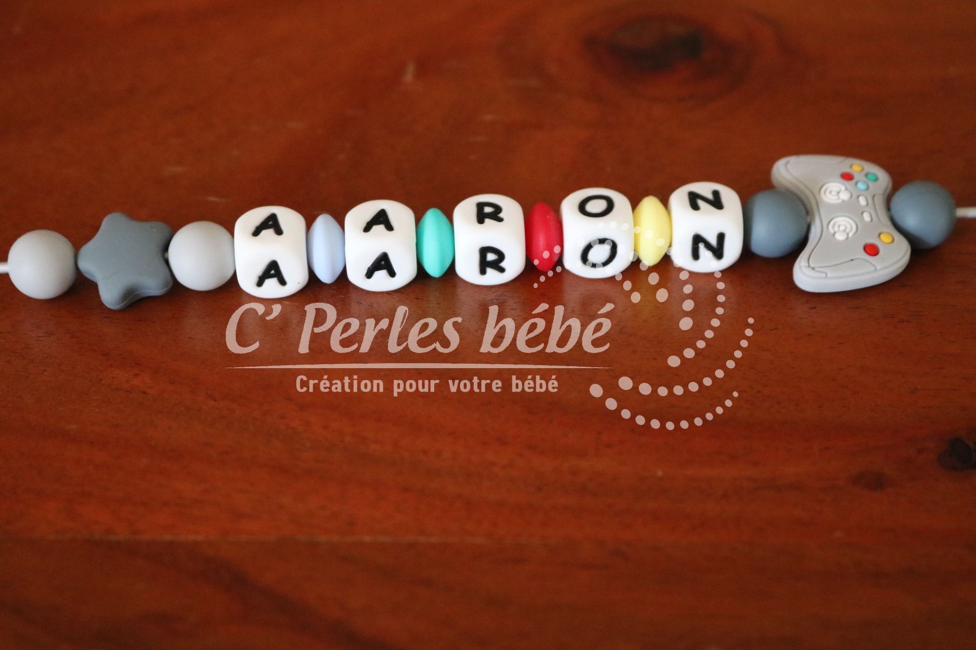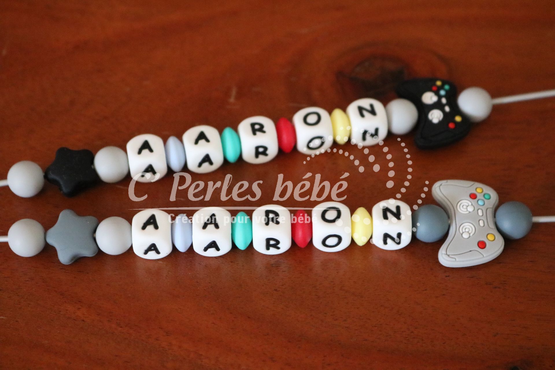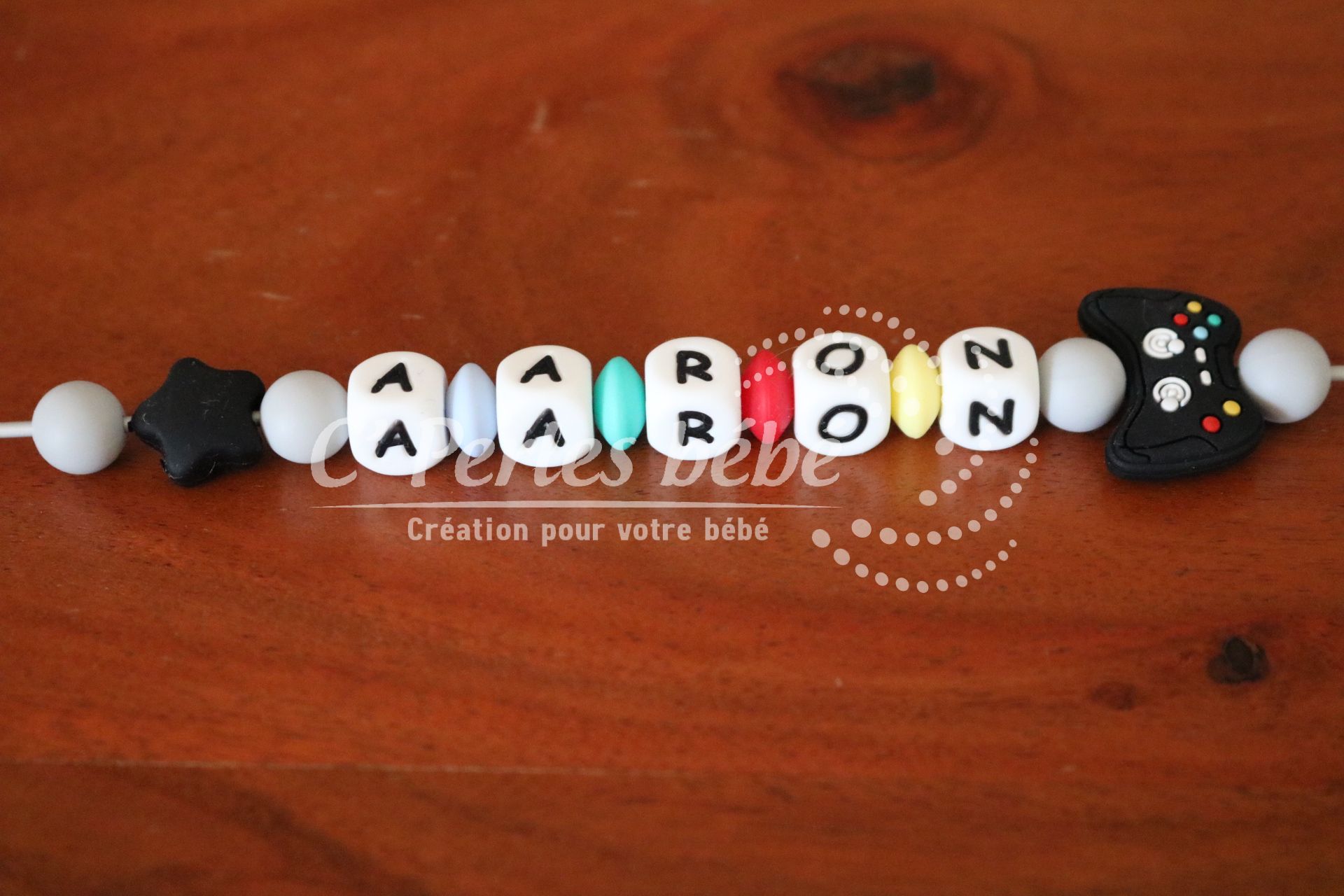 Attache sucette fait main par mes soins, modèle manette de jeu entièrement personnalisable. Perles en silicone, longueur max 22 cm (respect des normes de sécurité en vigueur). Adaptateur tétine MAM en option. Disponible également en version accroche doudou
