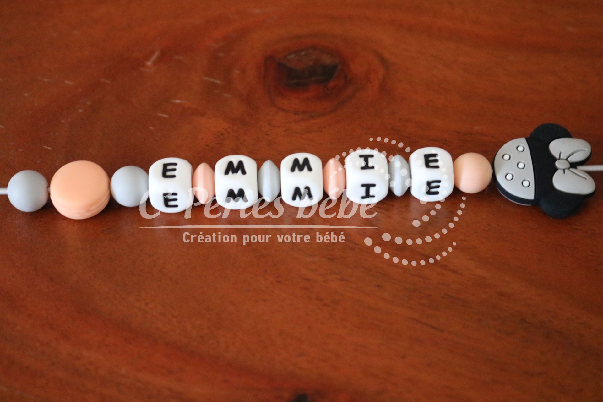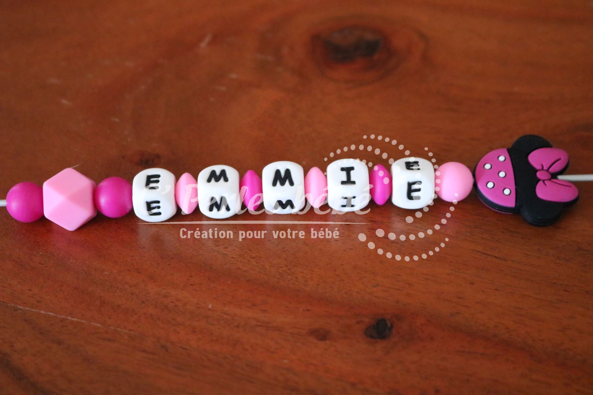 Attache sucette fait main par mes soins, modèle Minnie entièrement personnalisable. Perles en silicone, longueur max 22 cm (respect des normes de sécurité en vigueur). Adaptateur tétine MAM en option. Existe en version attache doudou (clip à chaque extrémité)