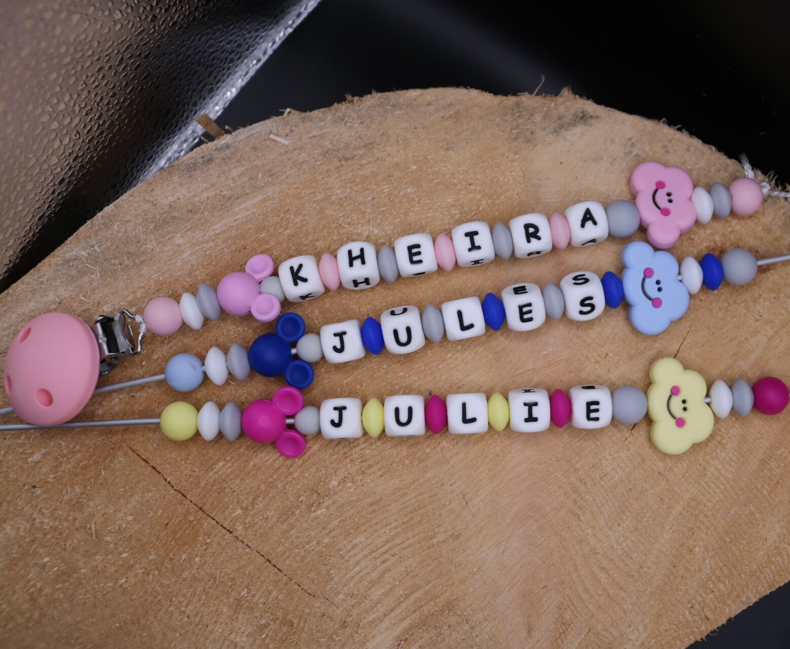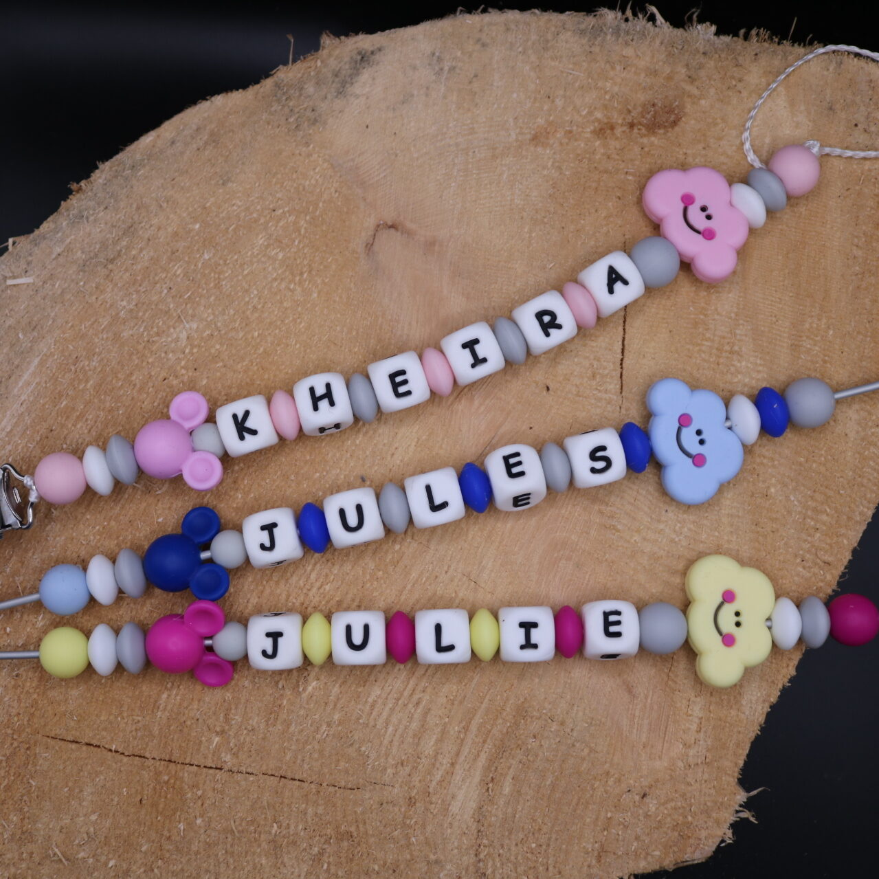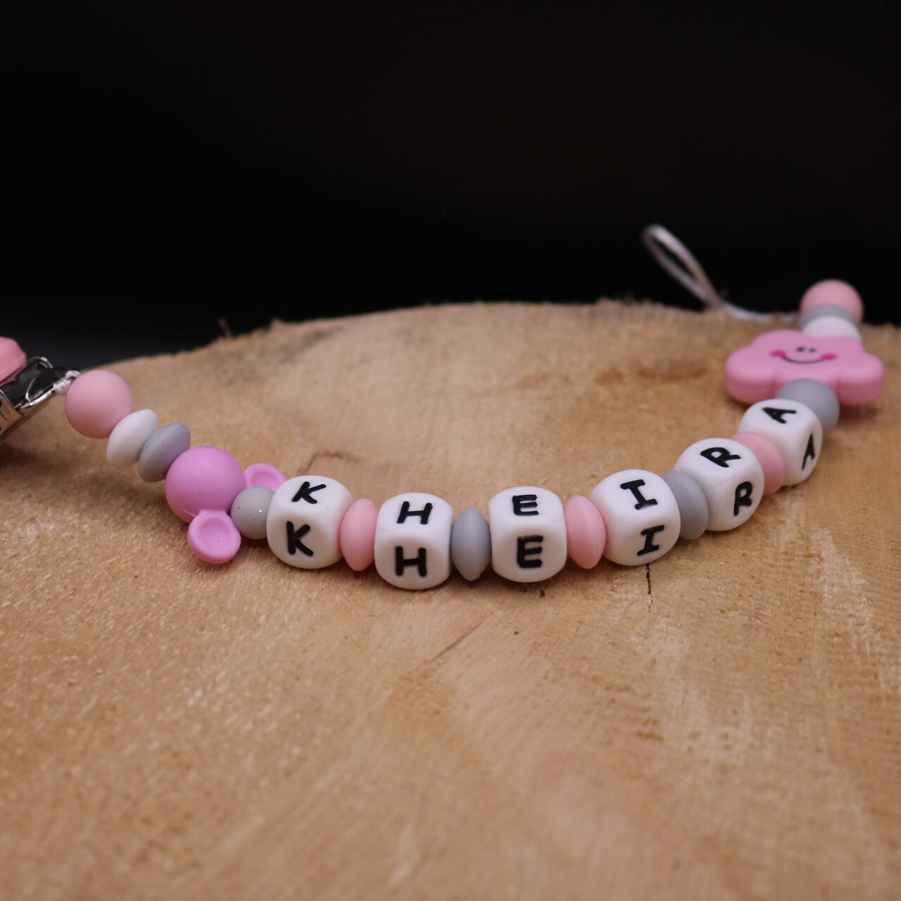 Longueur de l’attache tétine dépend du nombre de perles et de leur forme (normes 22cm max hors clip)