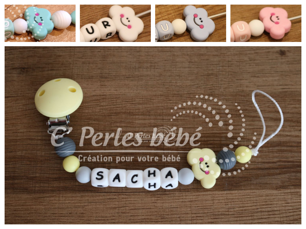 Attache sucette fait main par mes soins, entièrement personnalisable, modèle nuage. Perles en silicone, longueur max 22 cm (respect des normes de sécurité en vigueur). Adaptateur tétine MAM en option.