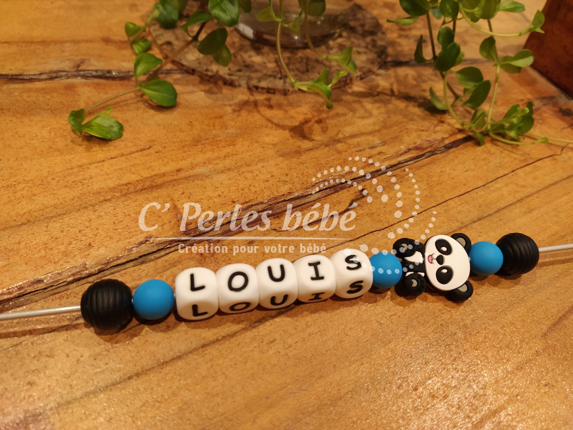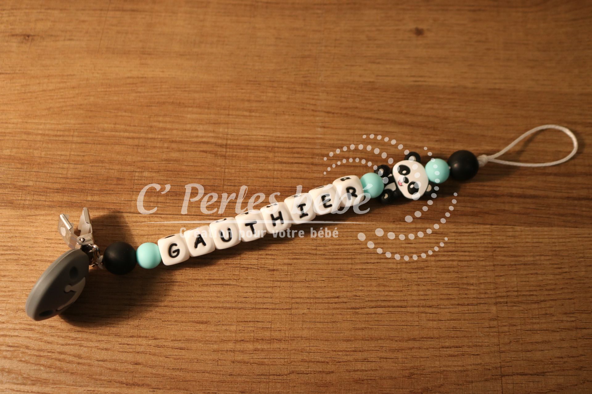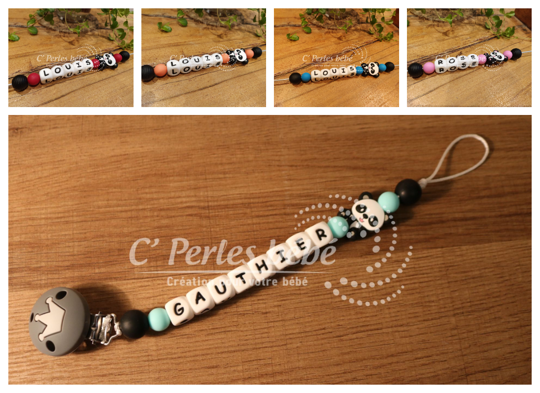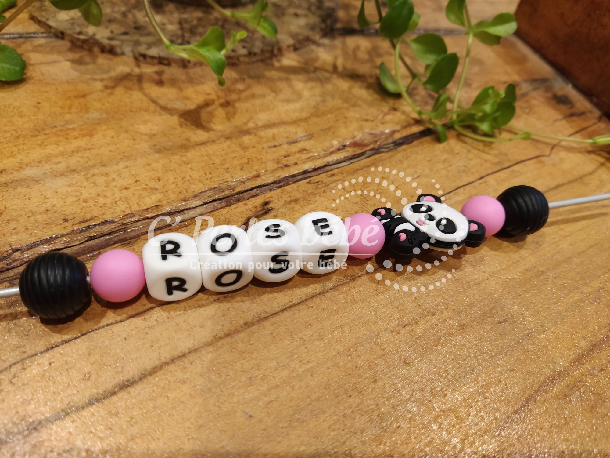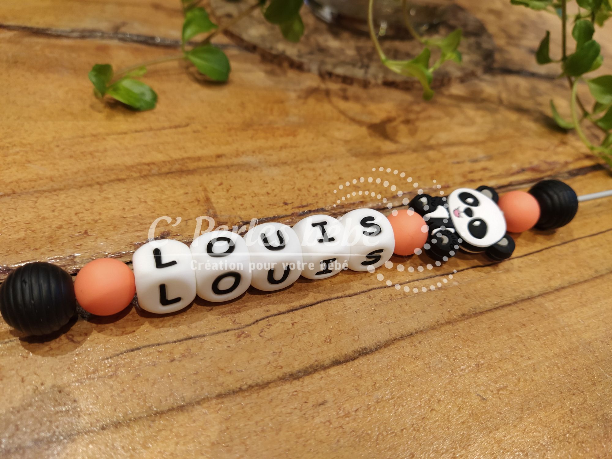 Attache sucette fait main par mes soins, modèle panda entièrement personnalisable. Perles en silicone, longueur max 22 cm (respect des normes de sécurité en vigueur). Adaptateur tétine MAM en option.
