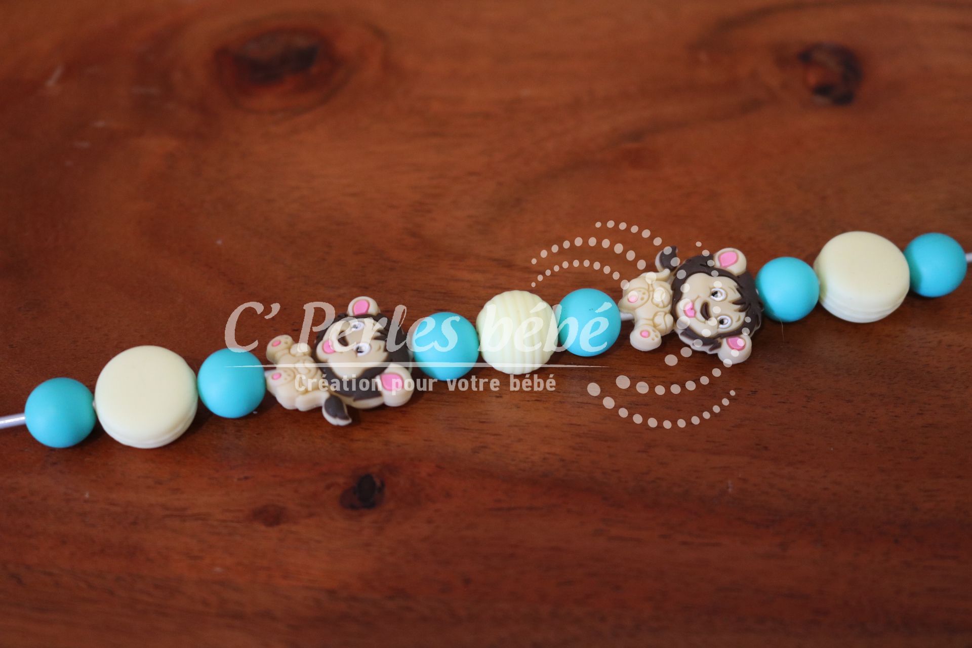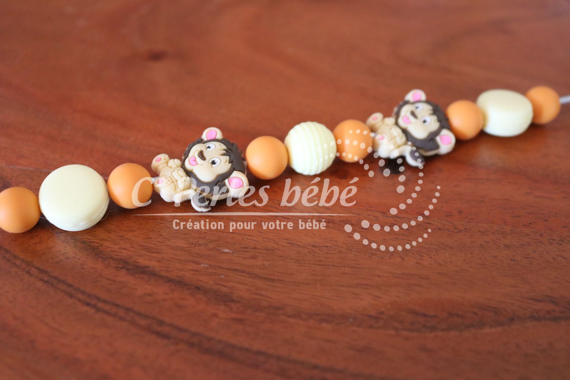 Attache sucette fait main par mes soins, modèle petit lion entièrement personnalisable. Perles en silicone, longueur max 22 cm (respect des normes de sécurité en vigueur). Adaptateur tétine MAM en option. Disponible en version accroche tétine ou attache doudou. Un petit Simba pour vous rappeler disney ! Les perles bleues ou oranges sont ponctuées de perles jaunes claires.