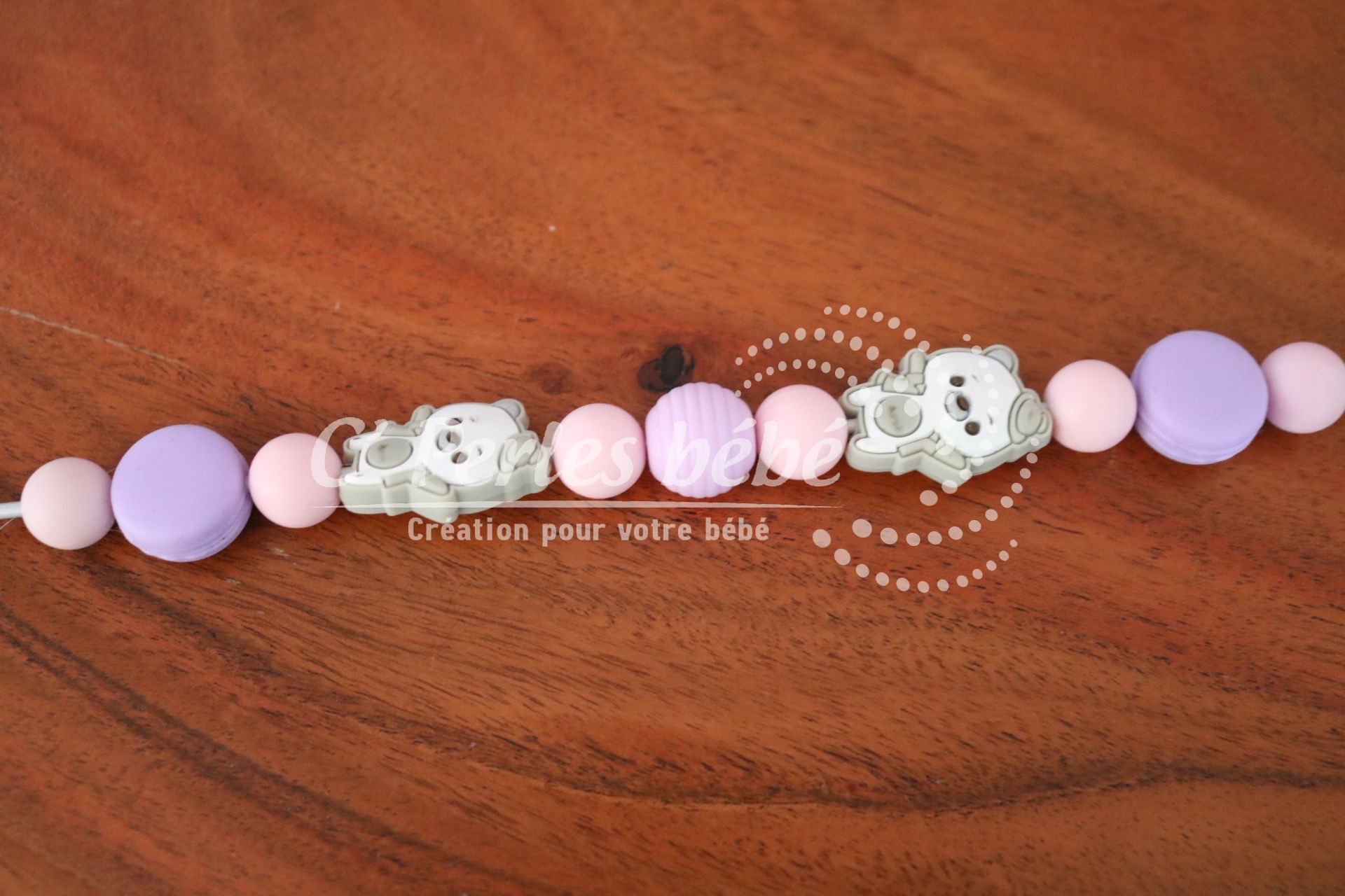 Attache sucette fait main par mes soins, modèle petit ourson coloris rose et violet. Perles en silicone, longueur max 22 cm (respect des normes de sécurité en vigueur). Adaptateur tétine MAM en option. Disponible en version accroche tétine ou attache doudou.