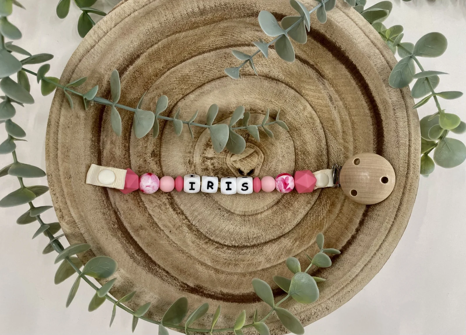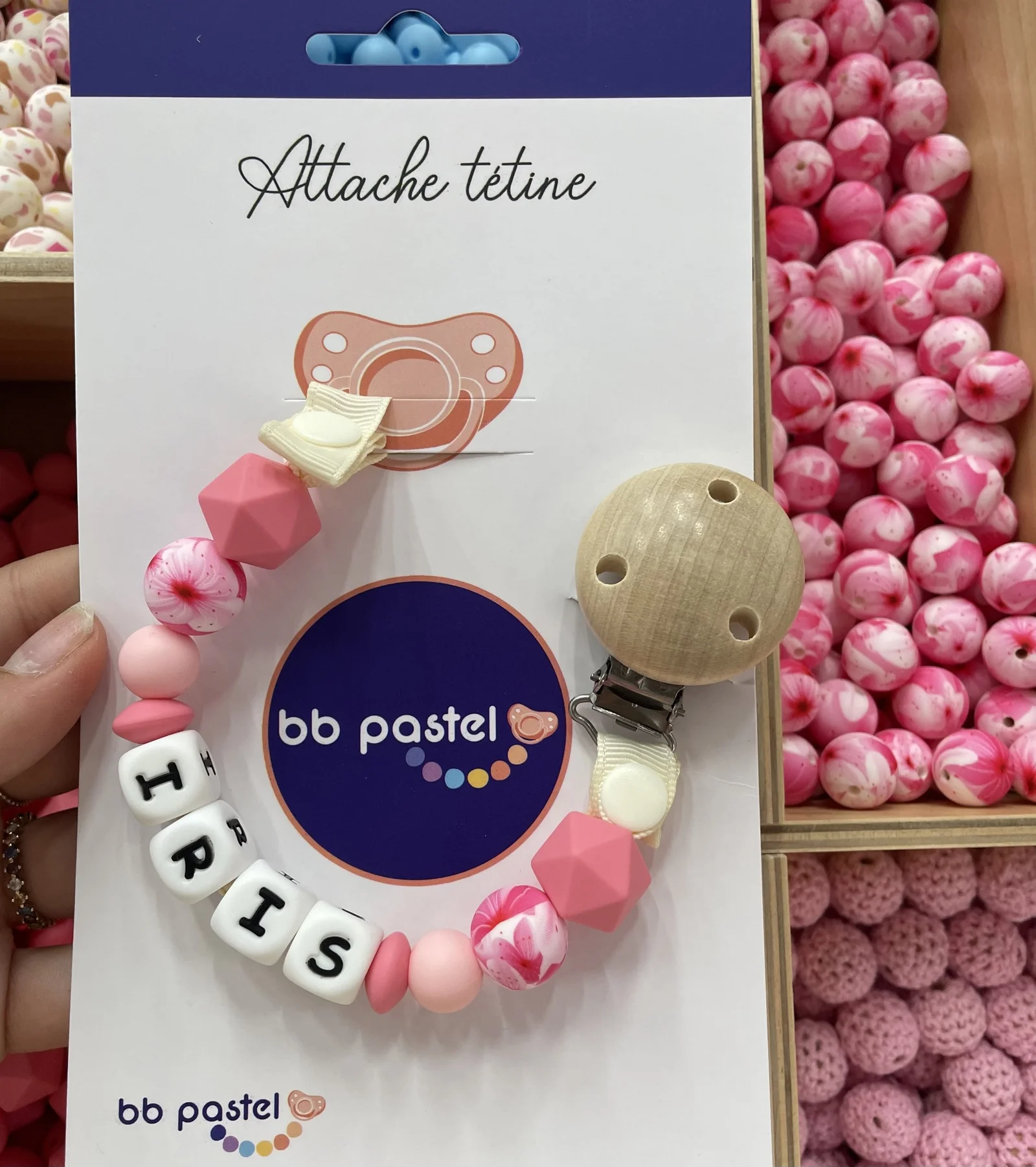 Modèle simple d’utilisation: L’attache tétine s’attache à l’anneau de la tétine grâce à un système de boutons pression.
