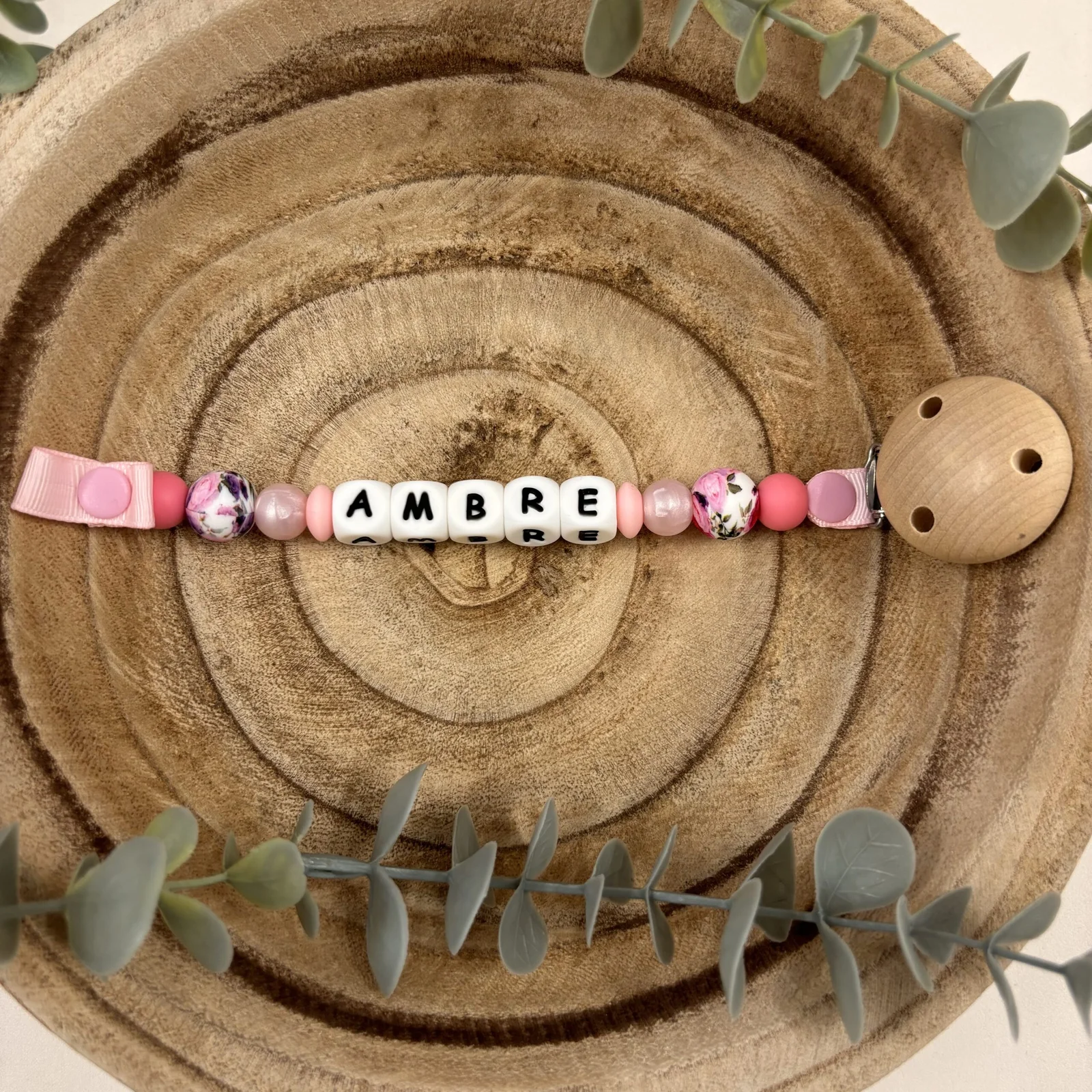 Attache tétine pivoine et rose nacré