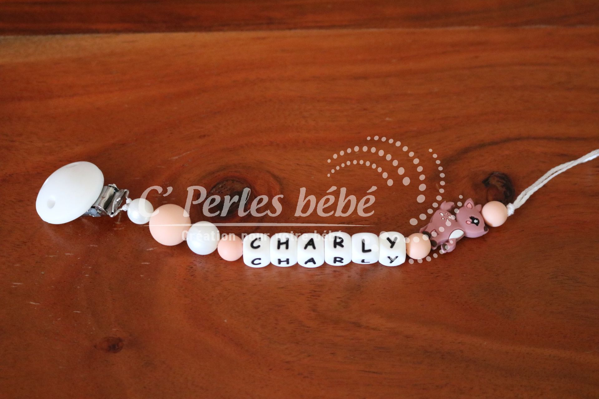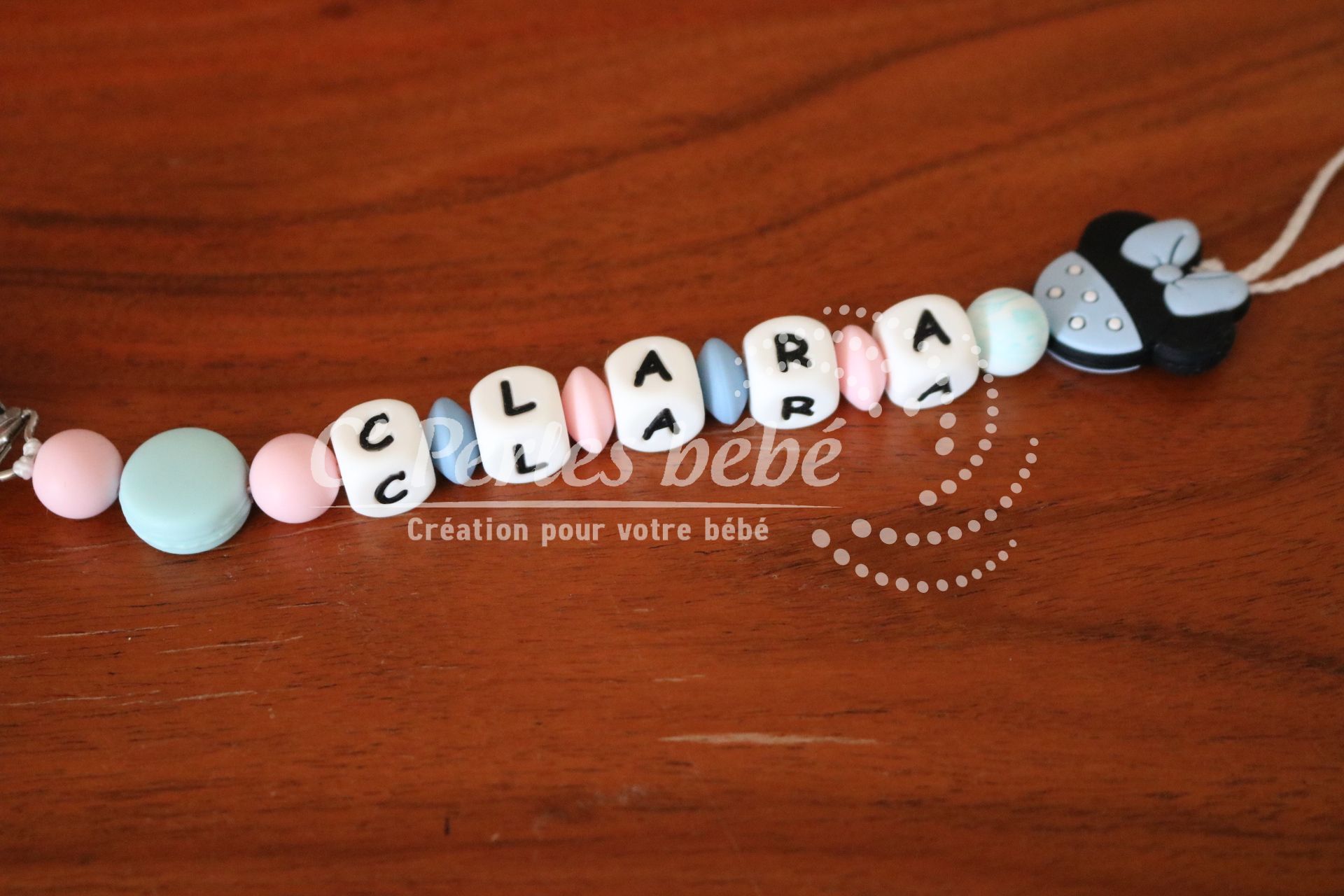 Attache sucette fille fait main par mes soins. L’attache tétine est personnalisable sur demande. Perles en silicone, longueur max 22 cm (respect des normes de sécurité en vigueur). Adaptateur tétine MAM en option. L’attache-tétine en silicone est un accessoire pratique, hygiénique et esthétique qui facilitera le quotidien des parents et contribuera au bien-être de bébé. Existe en version attache doudou avec un clip à chaque extrémité.
