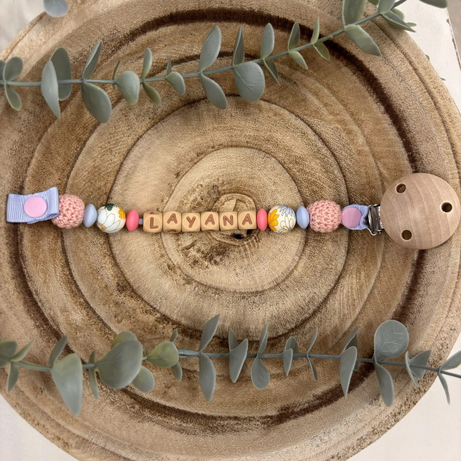 Modèle simple d’utilisation: L’attache tétine s’attache à l’anneau de la tétine grâce à un système de boutons pression.