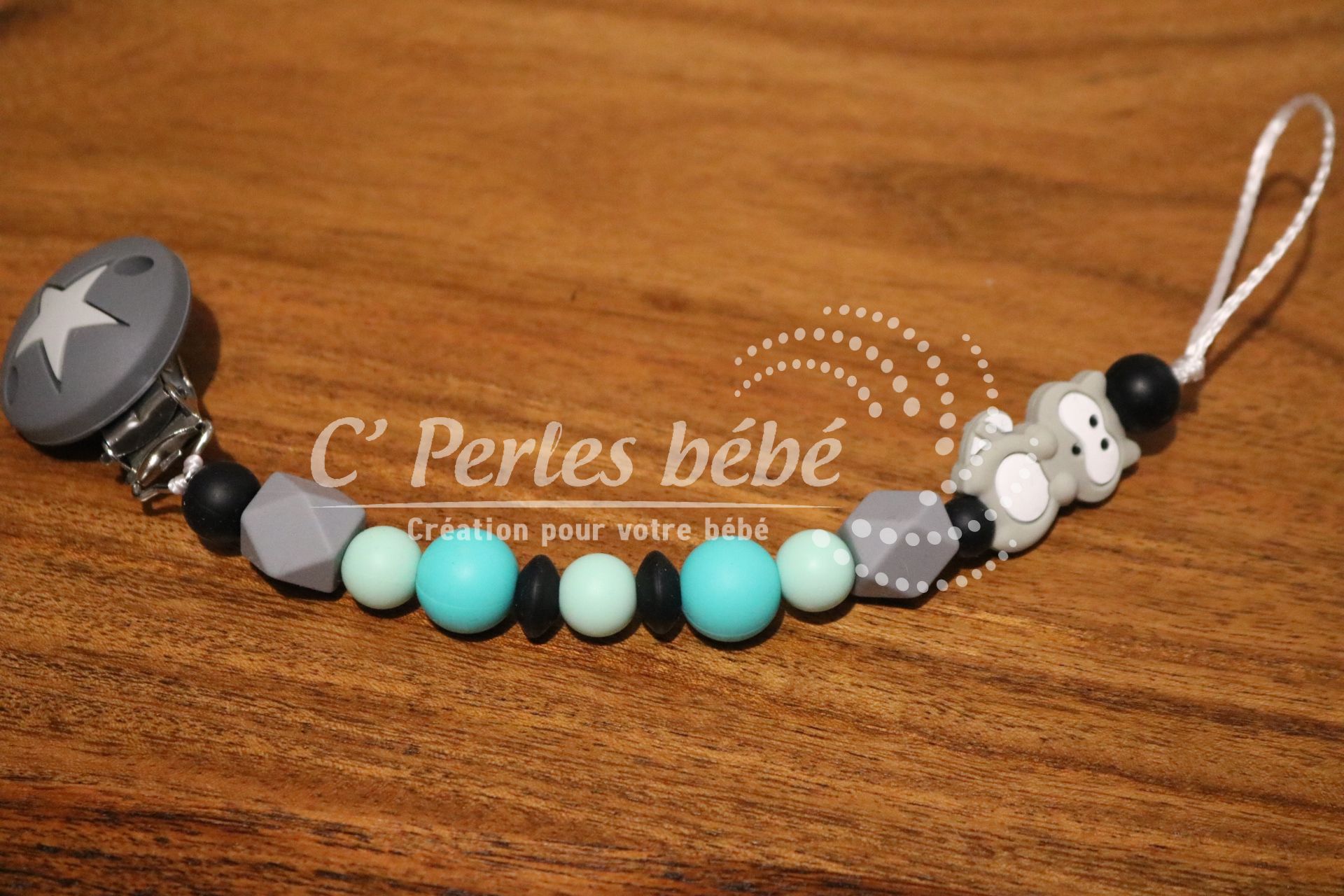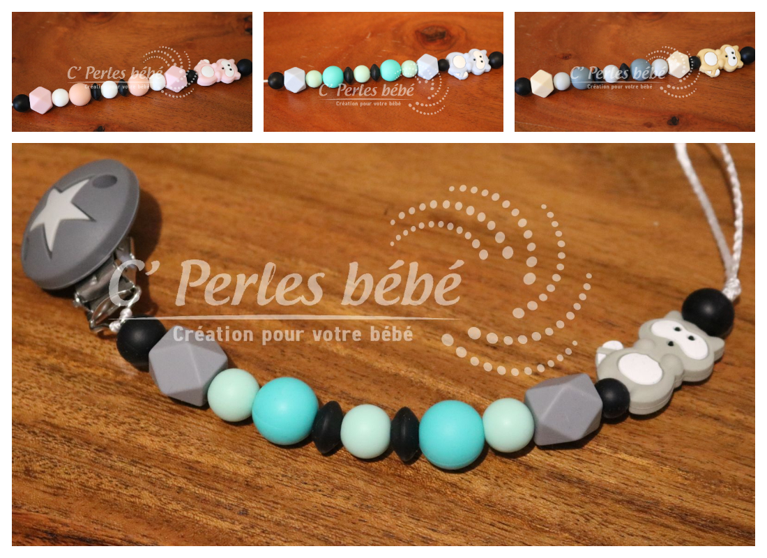 Attache sucette fait main par mes soins, modèle Raton entièrement personnalisable. Perles en silicone, longueur max 22 cm (respect des normes de sécurité en vigueur). Adaptateur tétine MAM en option. Existe en version accroche doudou et attache tétine.