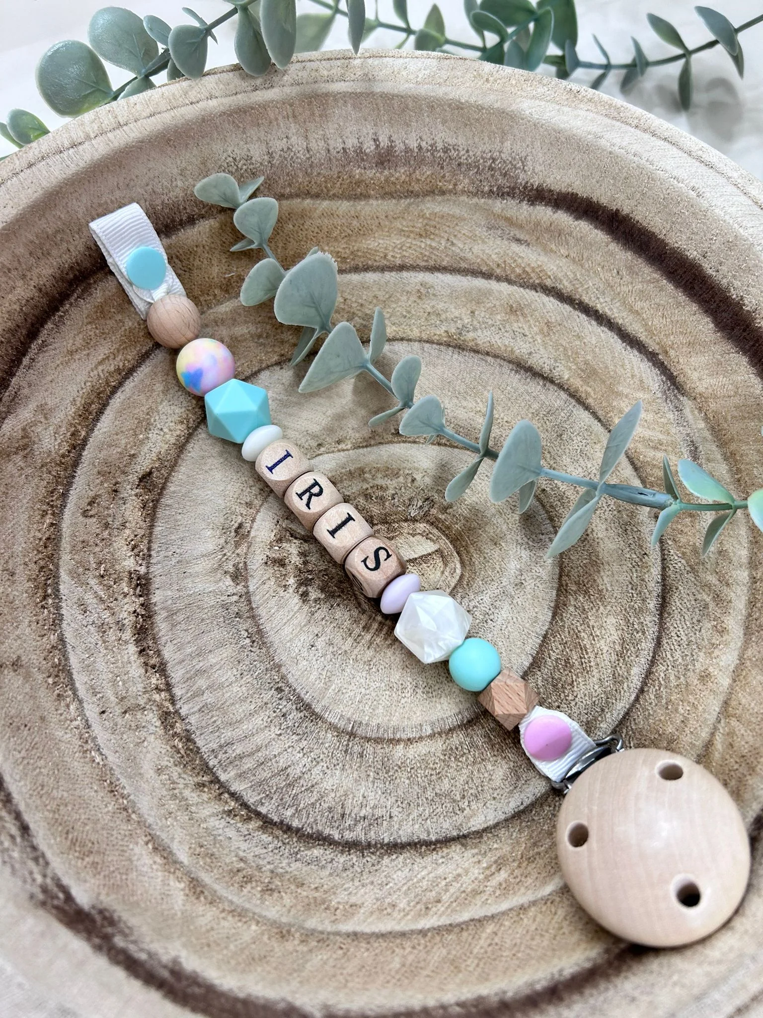 Modèle simple d’utilisation: L’attache tétine s’attache à l’anneau de la tétine grâce à un système de boutons pression.