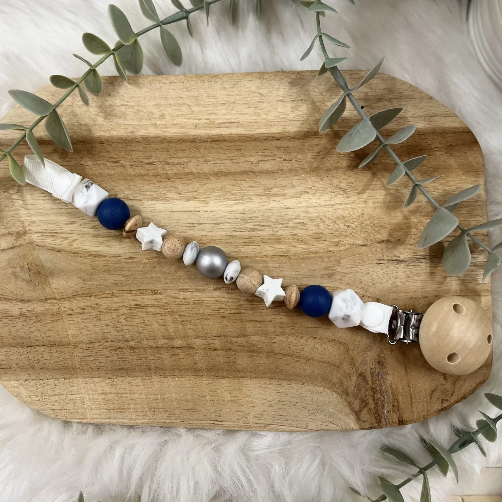 Attache tétine sans prénom – bleu marine et blanc marbré- sécurisé et unique