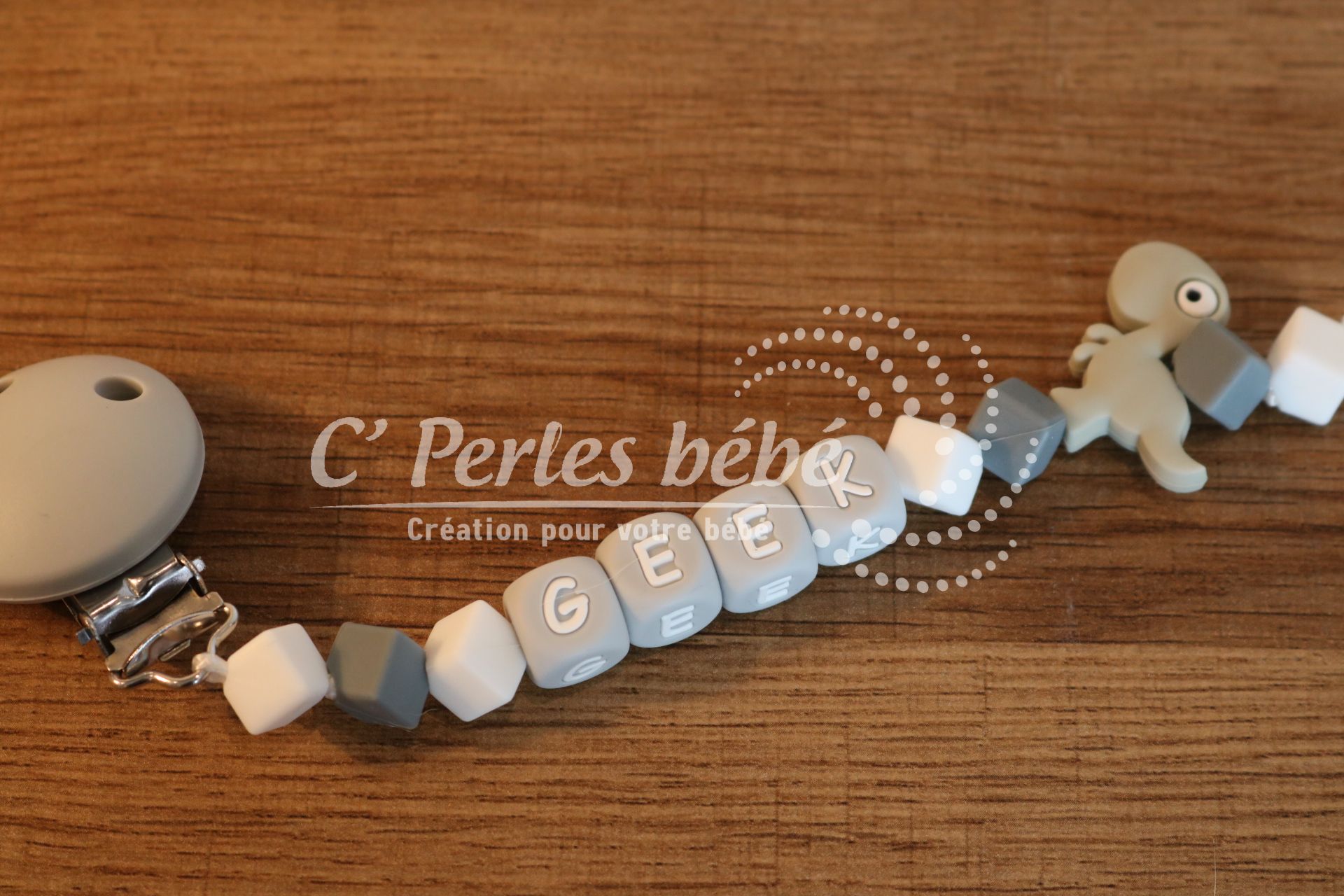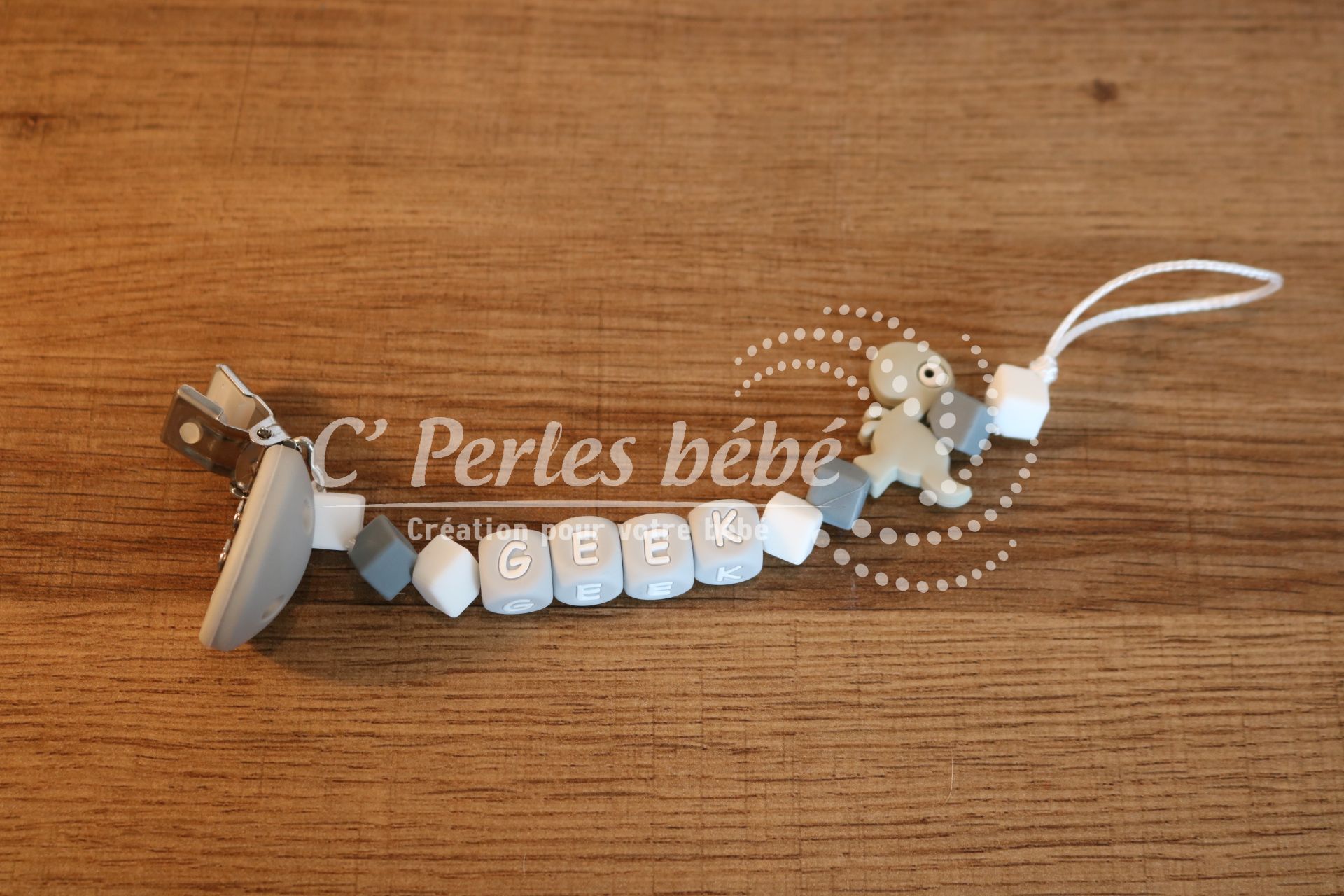 Attache sucette fait main par mes soins, modèle Geek entièrement personnalisable. Perles en silicone, longueur max 22 cm (respect des normes de sécurité en vigueur). Adaptateur tétine MAM en option.