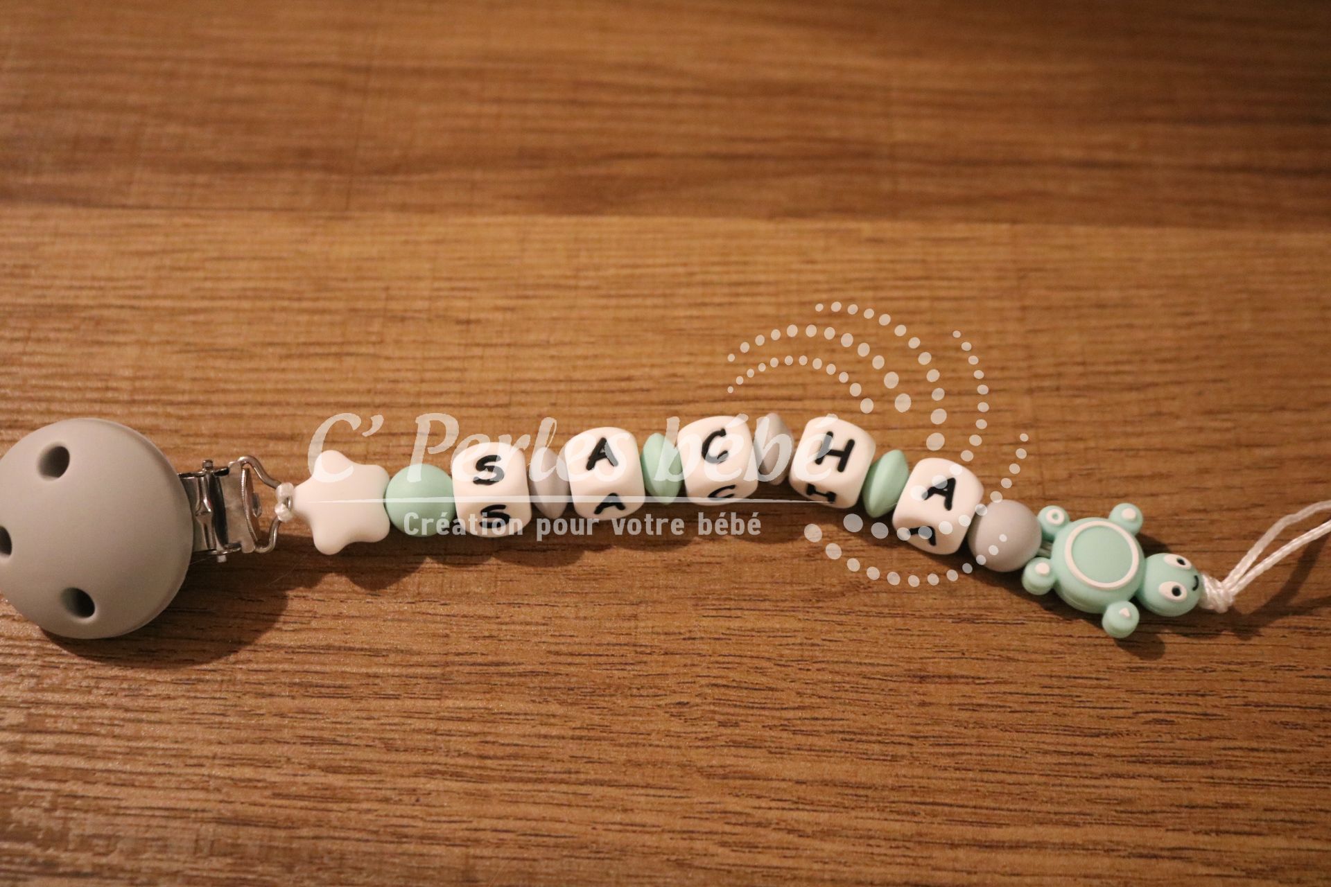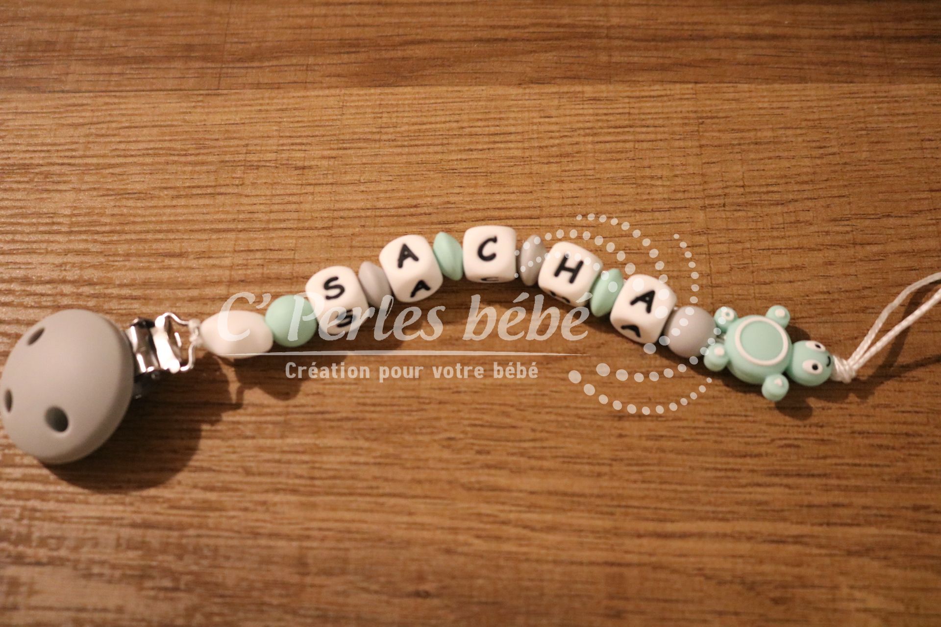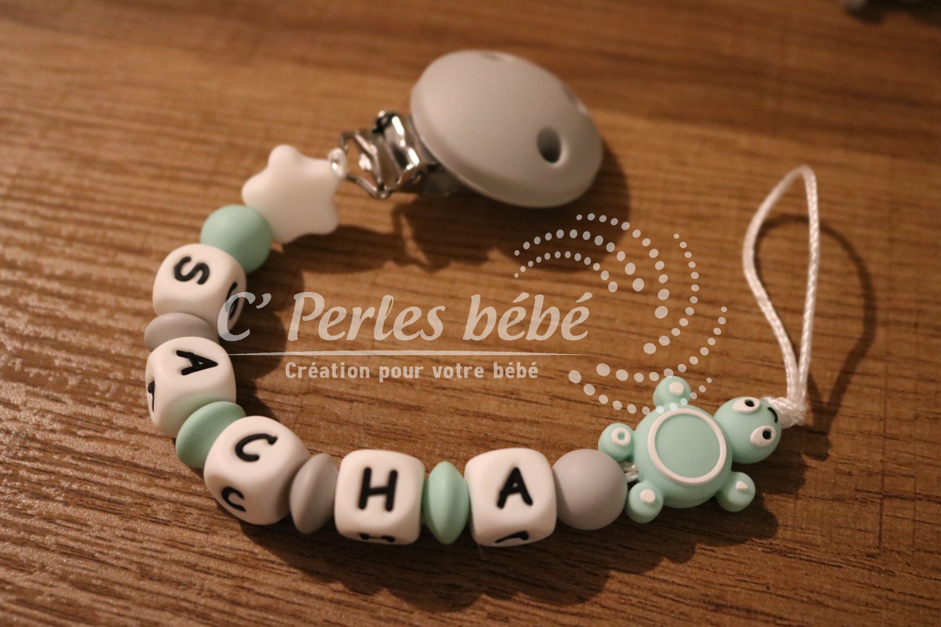 Attache sucette fait main par mes soins, modèle tortue entièrement personnalisable. Perles en silicone, longueur max 22 cm (respect des normes de sécurité en vigueur). Adaptateur tétine MAM en option.